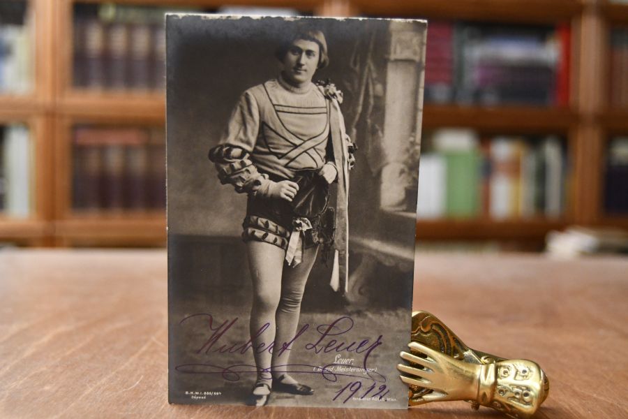 Porträtpostkarte von Hubert Leuer (* 1880 in Köln, †1969 in Wien) deutscher Opernsänger. Mit datierter handschriftlicher Signatur auf der Bildseite.