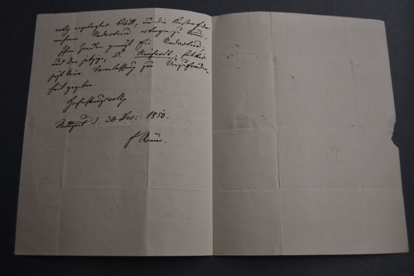 Beschreibung 1-1/2-seitiger handschriftlicher Brief von Friedrich Römer an Dr. Unger wegen einer Beschäftigung bei der zwischen 1849 und 1852 erschienenen Württembergischen Zeitung: "...habe ich Ihnen zu erwiedern die Ehre daß für die W. Zeitung ein Komite besteht welches deren finanzielle und literarische Angelegenheiten zu leiten hat und daß ich diesem Ihre beiden Schreiben vorgelegt habe. Diesem können freiwillige, sachgemäße Konkordanzen Dritter nur willkommen seyn; was dagegen eine Theilnahme an der Redaction betrifft, so ist die W. Zeitung bei ihrer beschränkten Geldmitteln kein so großartig angelegtes Blatt, um die Kosten für mehrere Redacteure tragen zu können. Ihren Zwecken genügt Ein Redacteur; und der jetzige, Dr. Reicherdt, hat bis jetzt keine Veranlassung zur Unzufriedenheit gegeben. ...".
