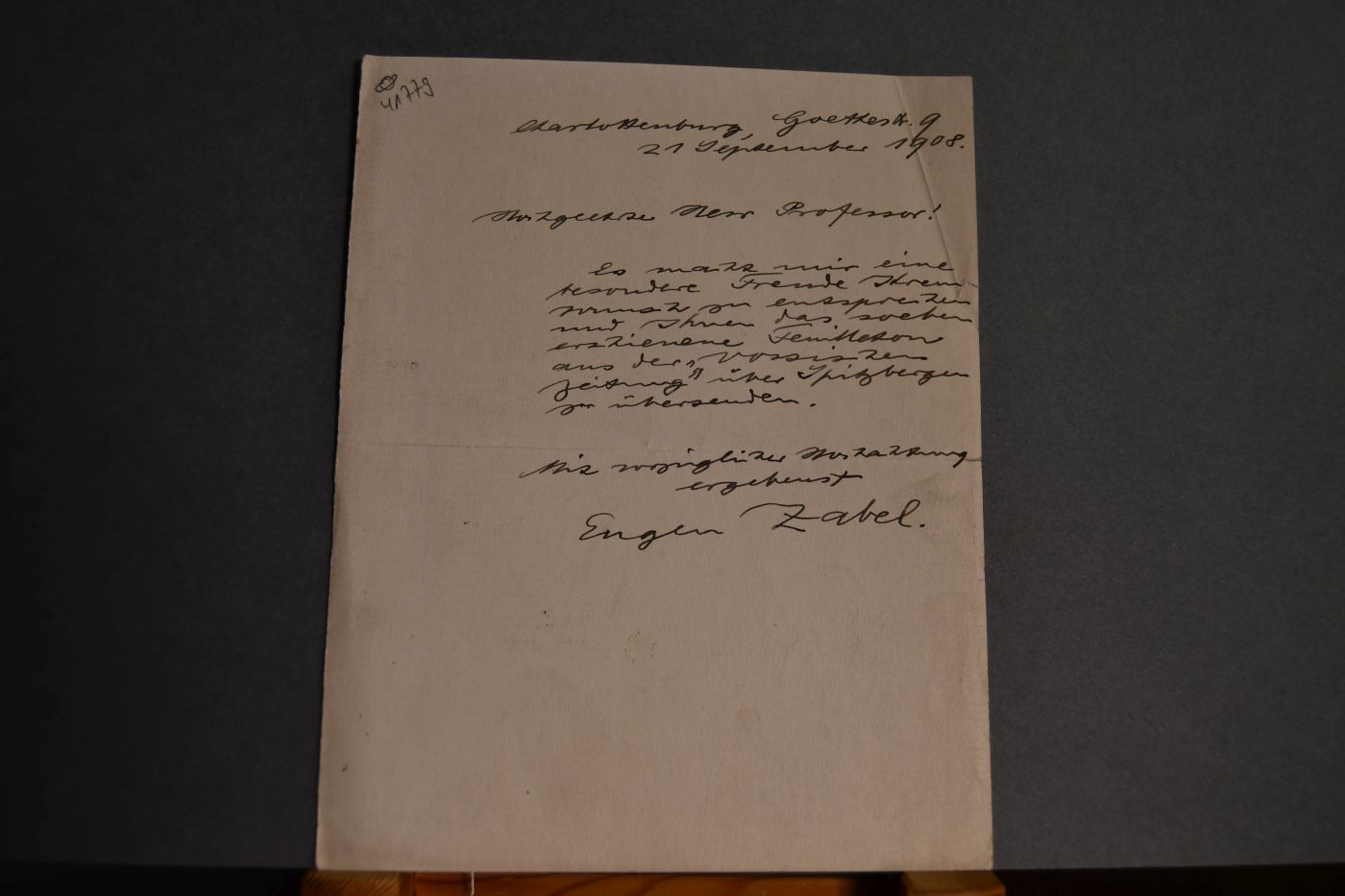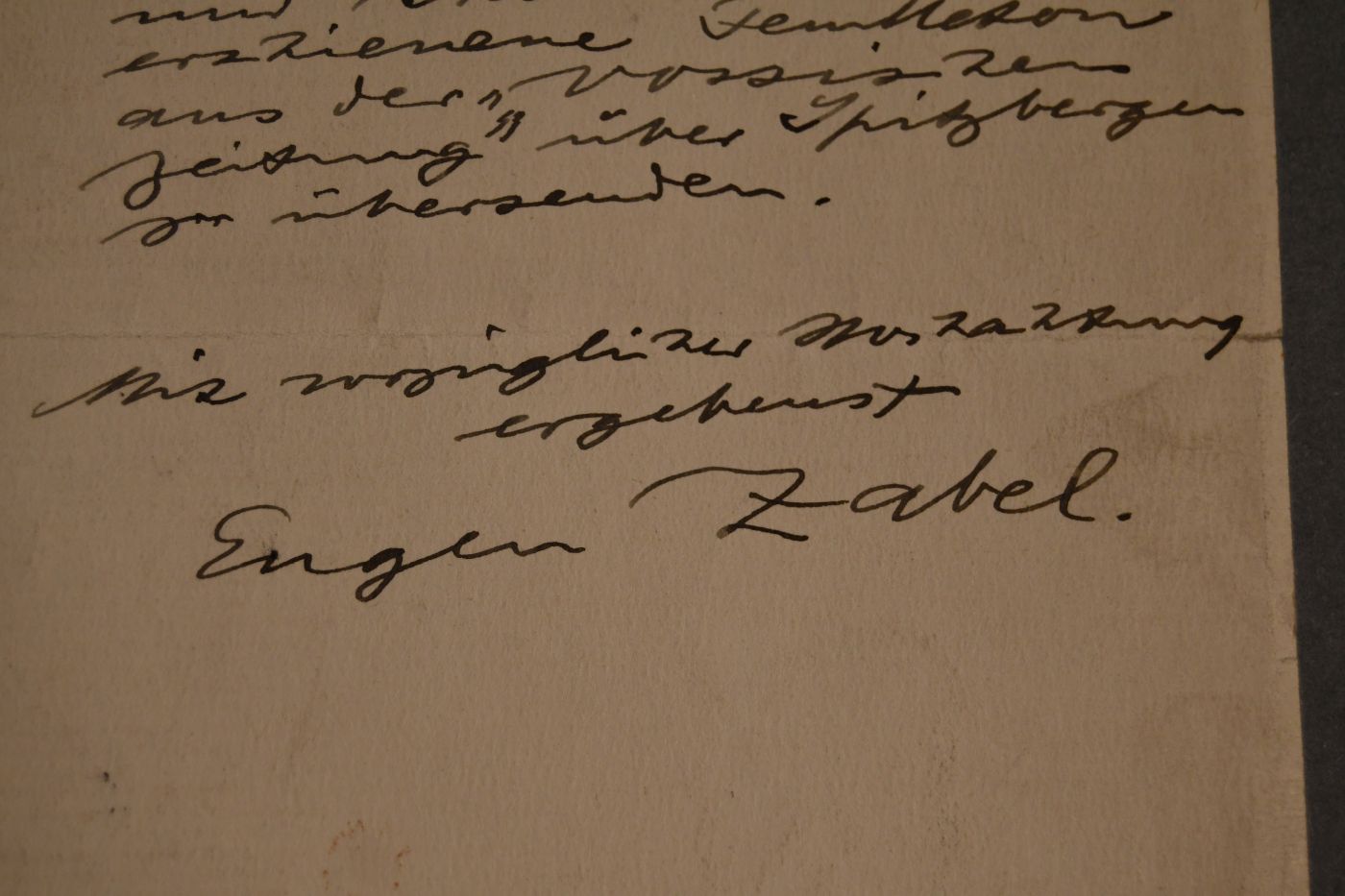 Beschreibung Einseitiges, handschriftliches Schreiben vom 21.9.1908. Zabel übersendet einen erbetenen Zeitungsartikel über Spitzbergen aus der Vossischen Zeitung.