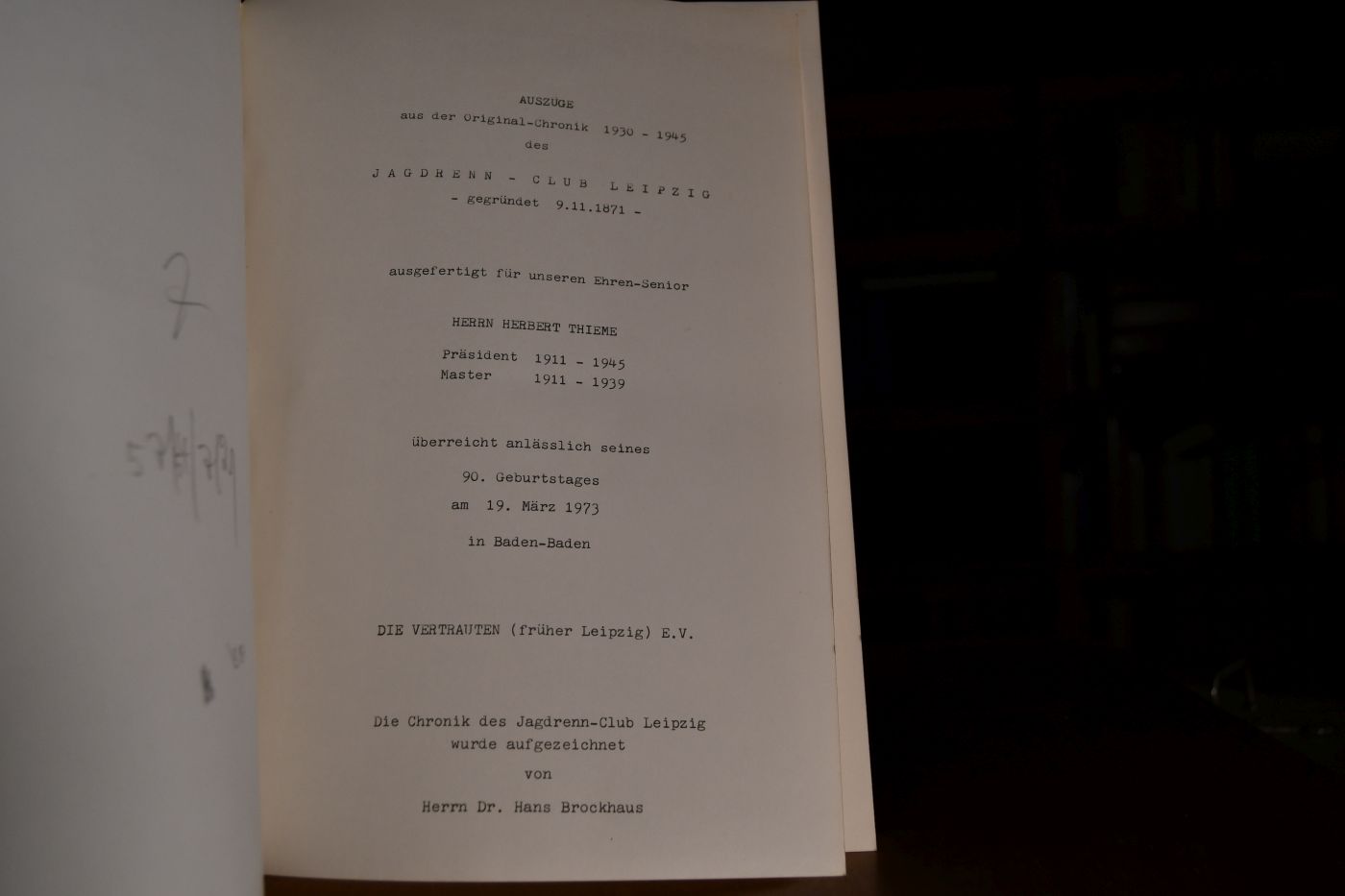 Auszüge aus der Original-Chronik 1930-1945 des Jagdrenn-Club Leipzig - gegründet 9.11.1871 - ausgefertigt für unseren Ehren-Senior Herrn Herbert Thieme Präsident 1911-1945, Master 1911-1939 überreicht anläßlich seines 90. Geburtstages am 19. März 1973 in Baden-Baden. Die Vertrauten (früher Leipzig) e.V.