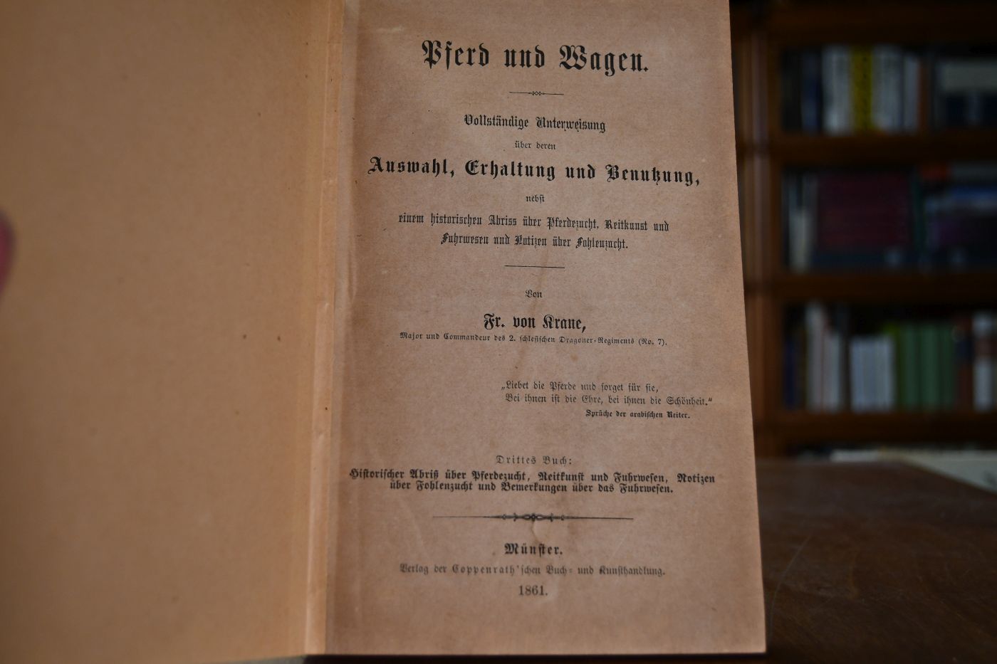 Pferd und Wagen. Vollständige Unterweisung über deren Auswahl, Erhaltung und Benutzung, nebst einem historischen Abriss über Pferdezucht, Reitkunst und Fuhrwesen und Notizen über Fohlenzucht. Dritter Buch (von 3) apart Historischer Abriß über Pferdezucht, Reitkunst und Fuhrwesen, Notizen über Fohlenzucht und Bemerkungen über das Fuhrwesen.