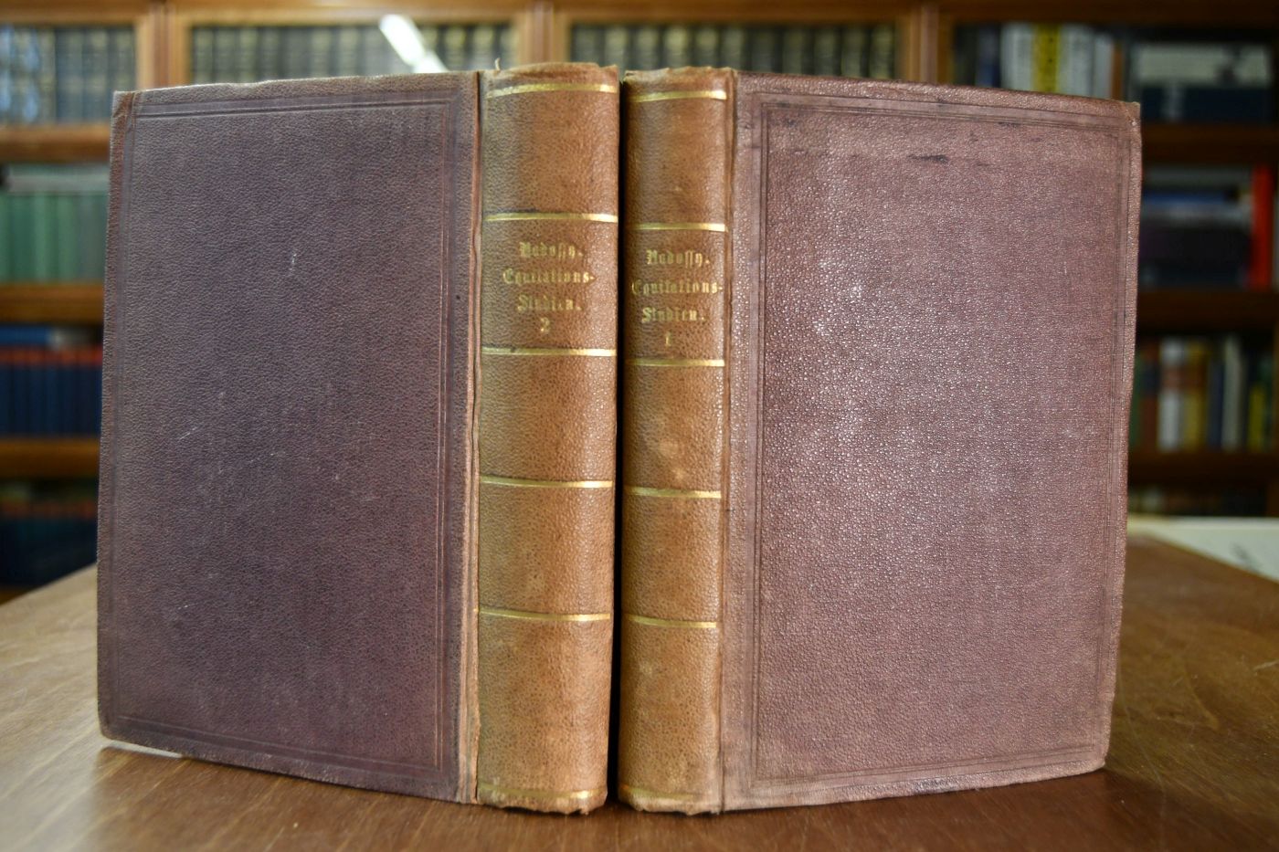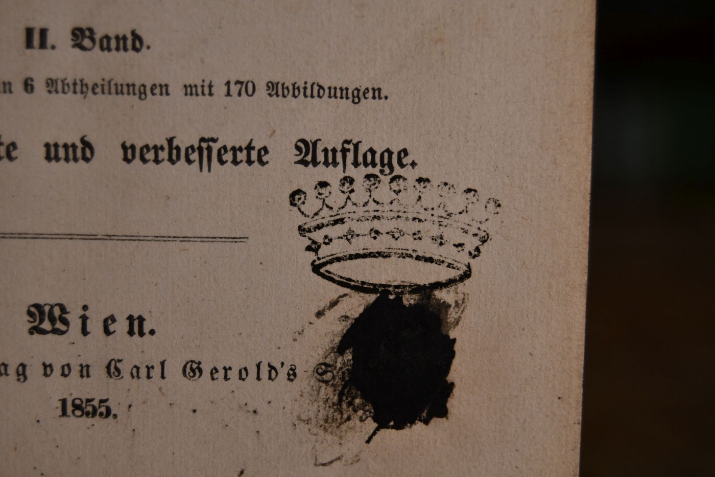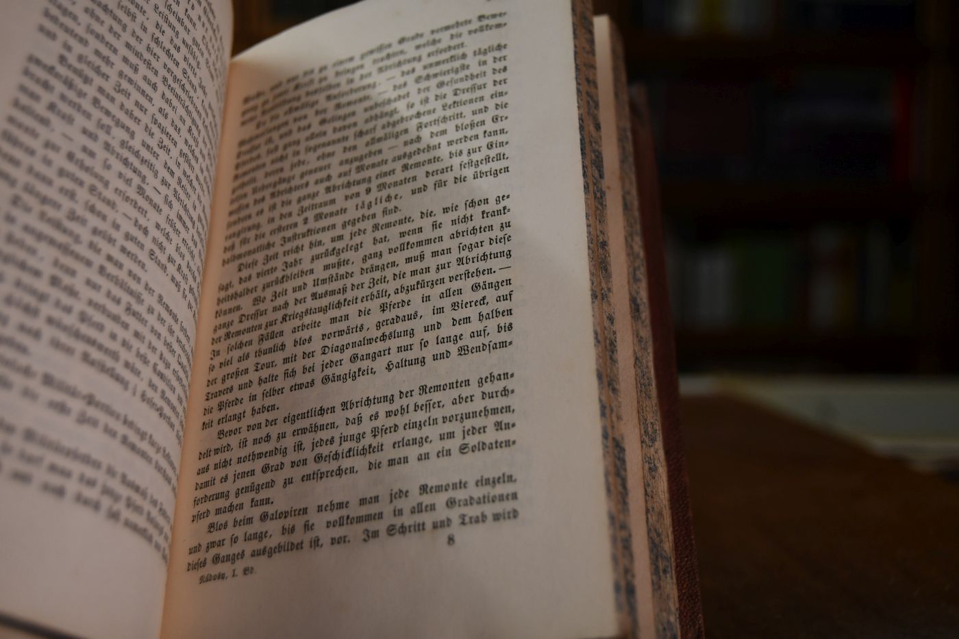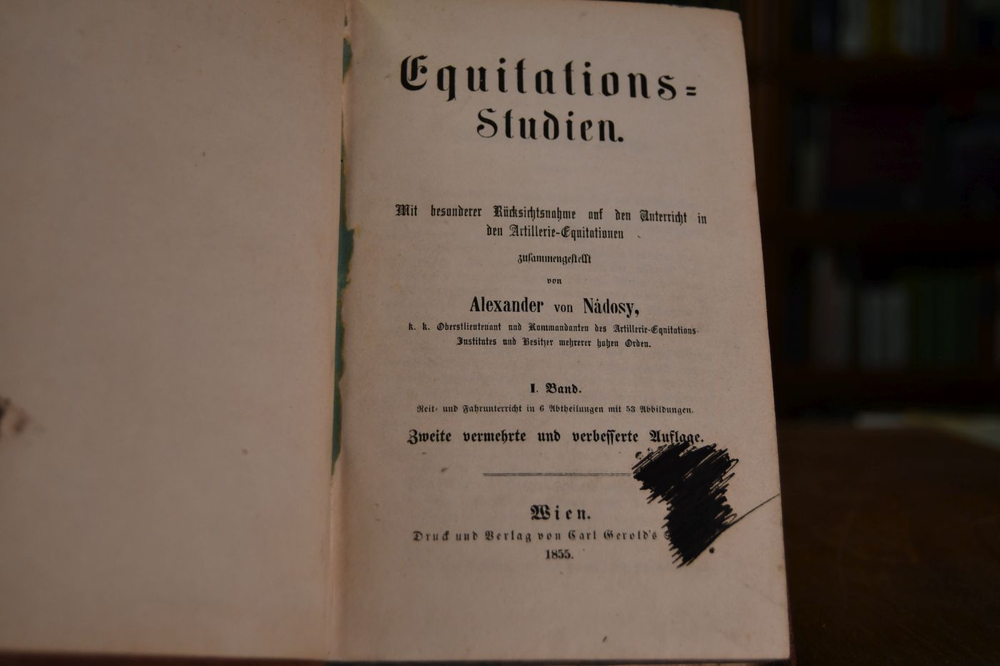 Beschreibung Einband berieben und bestoßen. Ausgestrichener gräflicher Besitzerstempel auf den Titelseiten. Durchgehend immer wieder fleckig. Falz von Bd. 2 in dem Tafelanhang geöffnet. Die Tafeln an den Rändern angeschmutzt und mit Einrissen. Diese Auflage kam nicht in den Buchhandel (Graefe, Hippologische Literatur S. 124). Alexander von Nadosy wurde in Munkacs in Ungarn am 20. März 1811 geboren, studierte an der Universität Pest und trat 1829 in den Militärdienst ein. 1850 erhielt er den Befehl zur Errichtung eines Artillerie-Equitations-Instituts, welches 1852 ins Leben trat und dessen Leiter er als Oberst wurde. Nach Aufhebung dieses Instituts wurde er 1859 zum Leiter der Spanischen Hof-Reitschule ernannt. Er starb 1892.