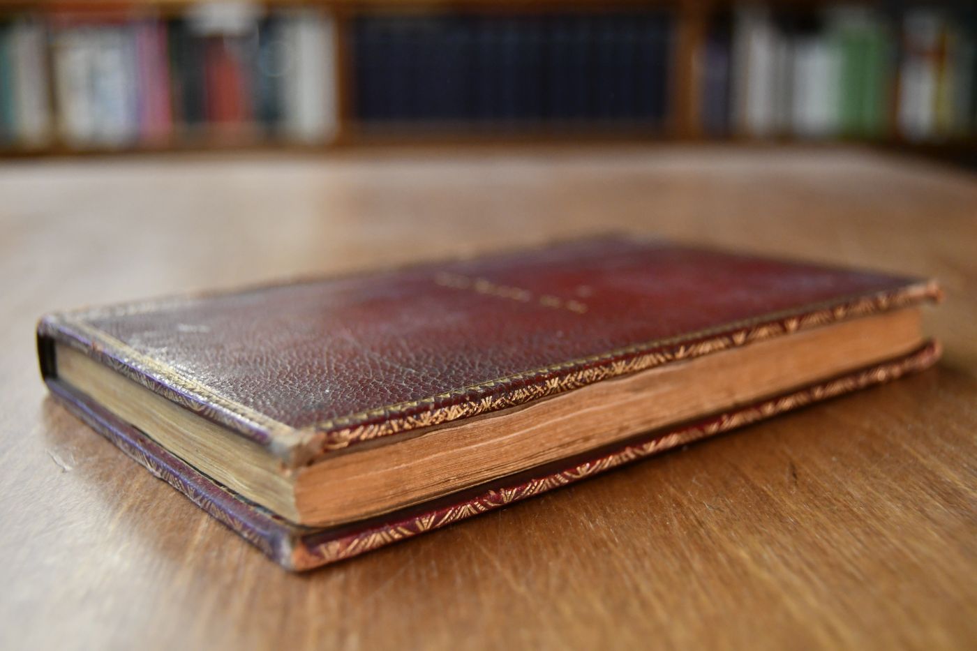 Format 16 x 11 cm, Leder der Zeit auf 5 Bünden mit Rückenschild, Rücken- und umlaufender Stegrandvergoldung.