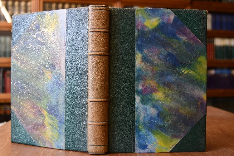 Format 21 x 16 cm, Halbleder mit 4 Bünden und umlaufenden Sprengschnitt