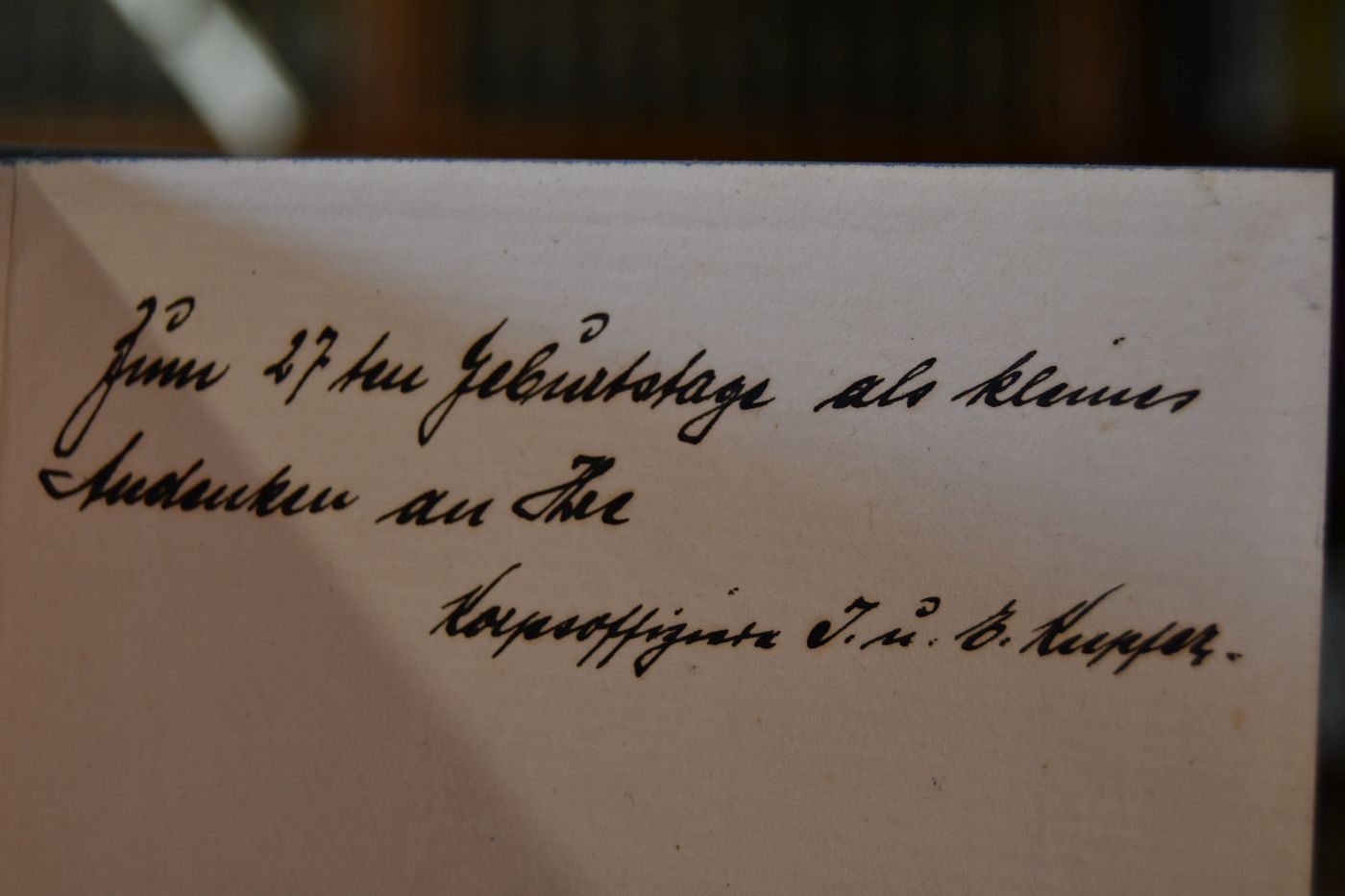 Beschreibung Einband berieben, angeschmutzt und fleckig. Schnitt fleckig. Handschriftliche Widmung (von den Korpsoffizieren J. u. E. Kupfer) auf dem fliegenden Vorsatz.