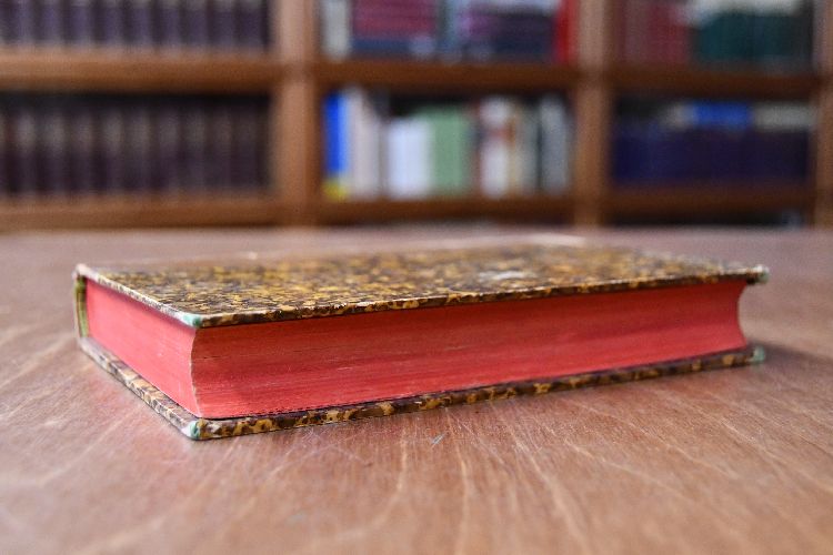 Format 19 x 13 cm, Halbleder mit 4 Bünden, Rückenschild und umlaufendem Farbschnitt