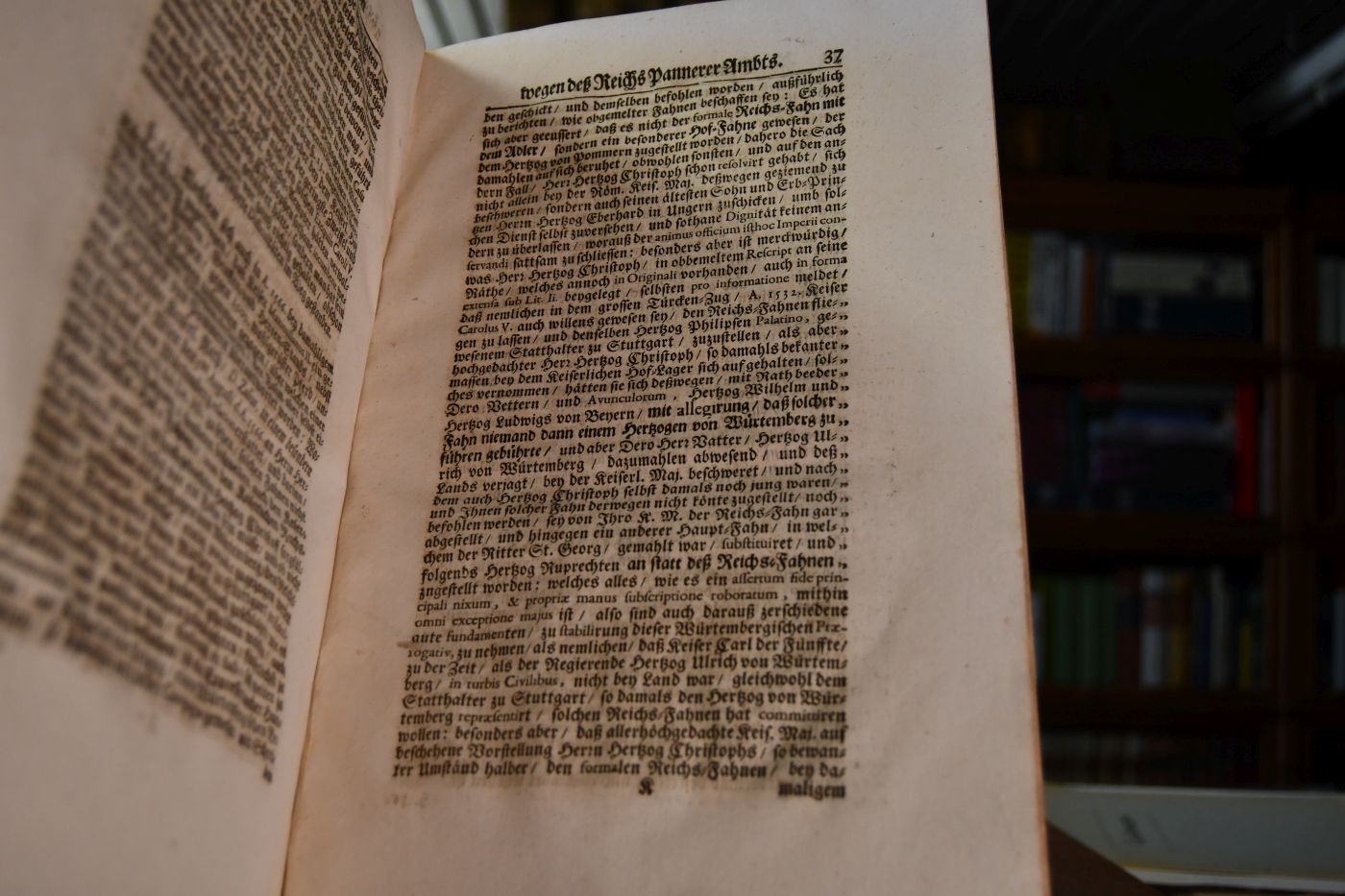 Gründliche Deduction, daß dem hochfürstl. Haus Würtemberg das Reichs-Panner- oder Reichs-Fendrich-Ambt, Praedicat und Insigne, schon von etlichen Seculis her, rechtmäßig zustehe und dahero ohne Kränckung desselben althergebrachter Praerogativen, keinem andern Chur- oder Fürsten erst neuerlich verliehen werden könne. Mit Beylagen von Lit. A bis Qq.