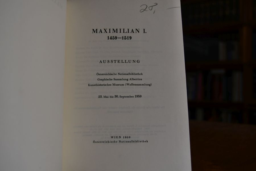 Maximilian I. 1459-1519. Ausstellung Österreichische Nationalbibliothek, Graphische Sammlung Albertina, Kunsthistorisches Museum (Waffensammlung) 23. Mai bis 30. September 1959.