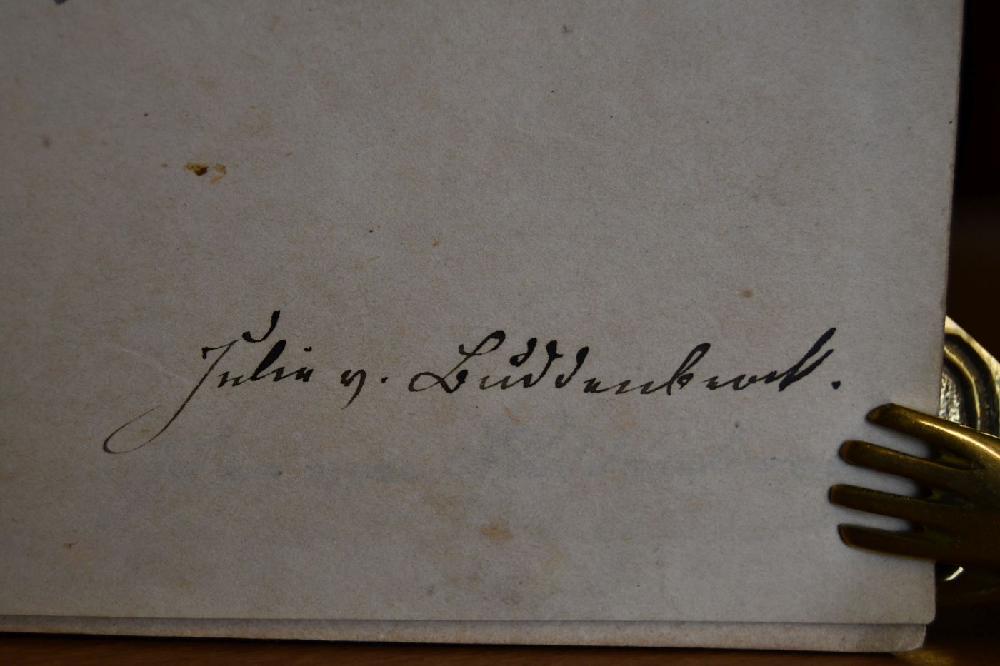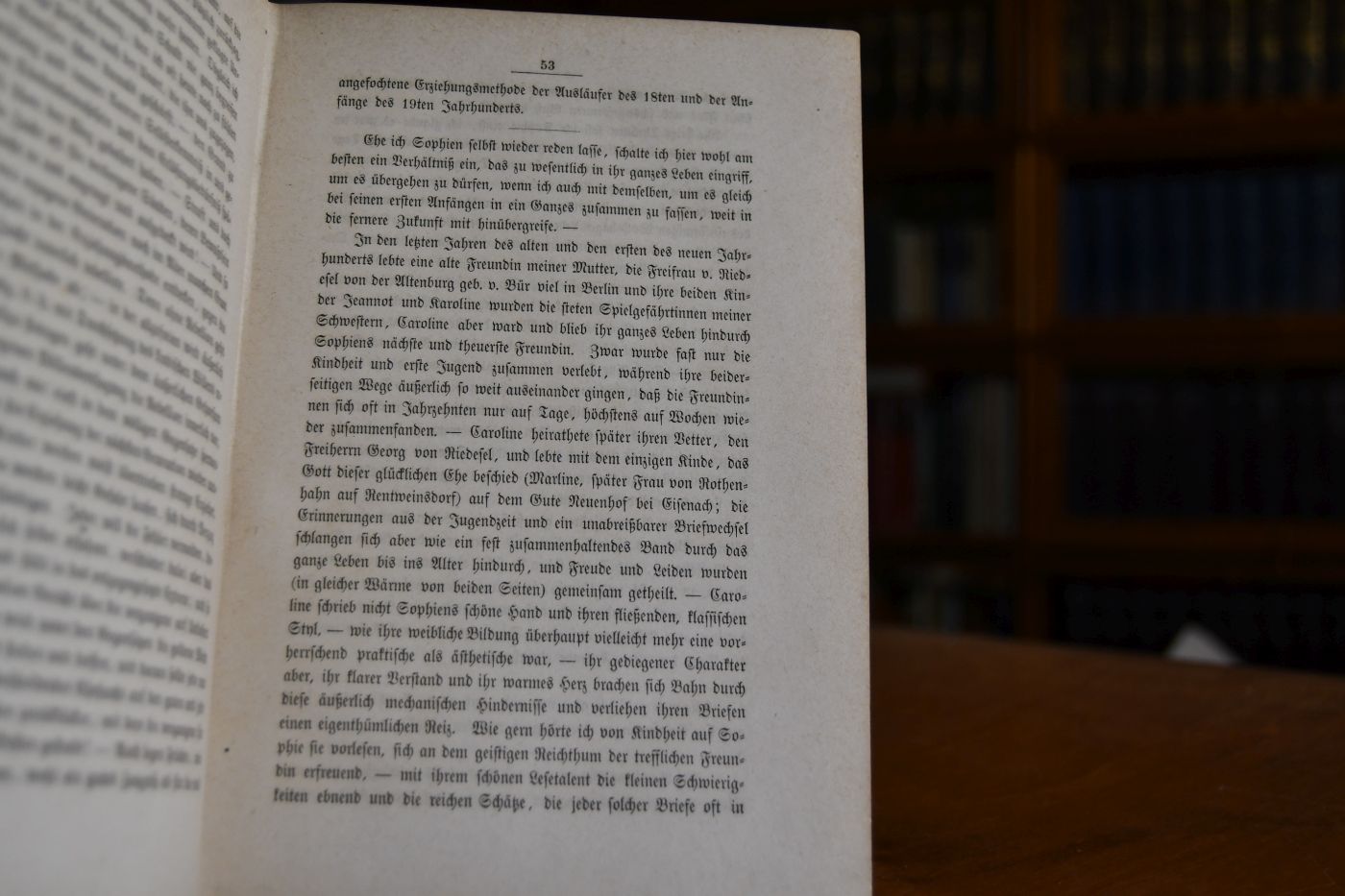 Beschreibung Einband berieben, bestoßen und mit längeren Einrissen am Rücken. Bindung derersten Lagen etwas gelockert. Handschriftlicher Besitzereintrag (Julie v. Buddenbrock) auf fliegendem Vorsatz und Titel. Papierbeingt gebräunt. Gelegentlich etwas fleckig.