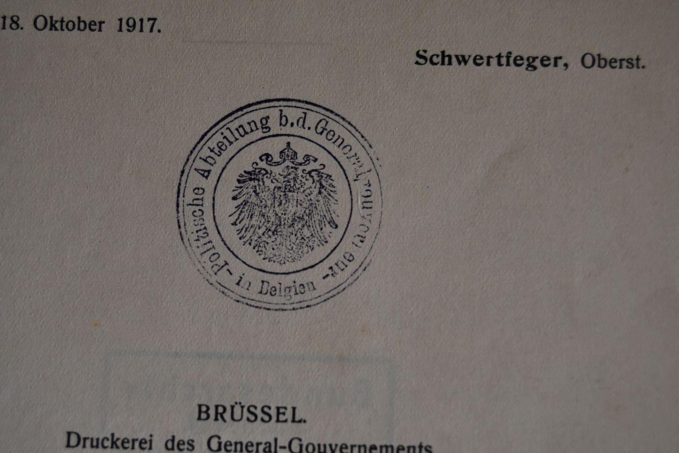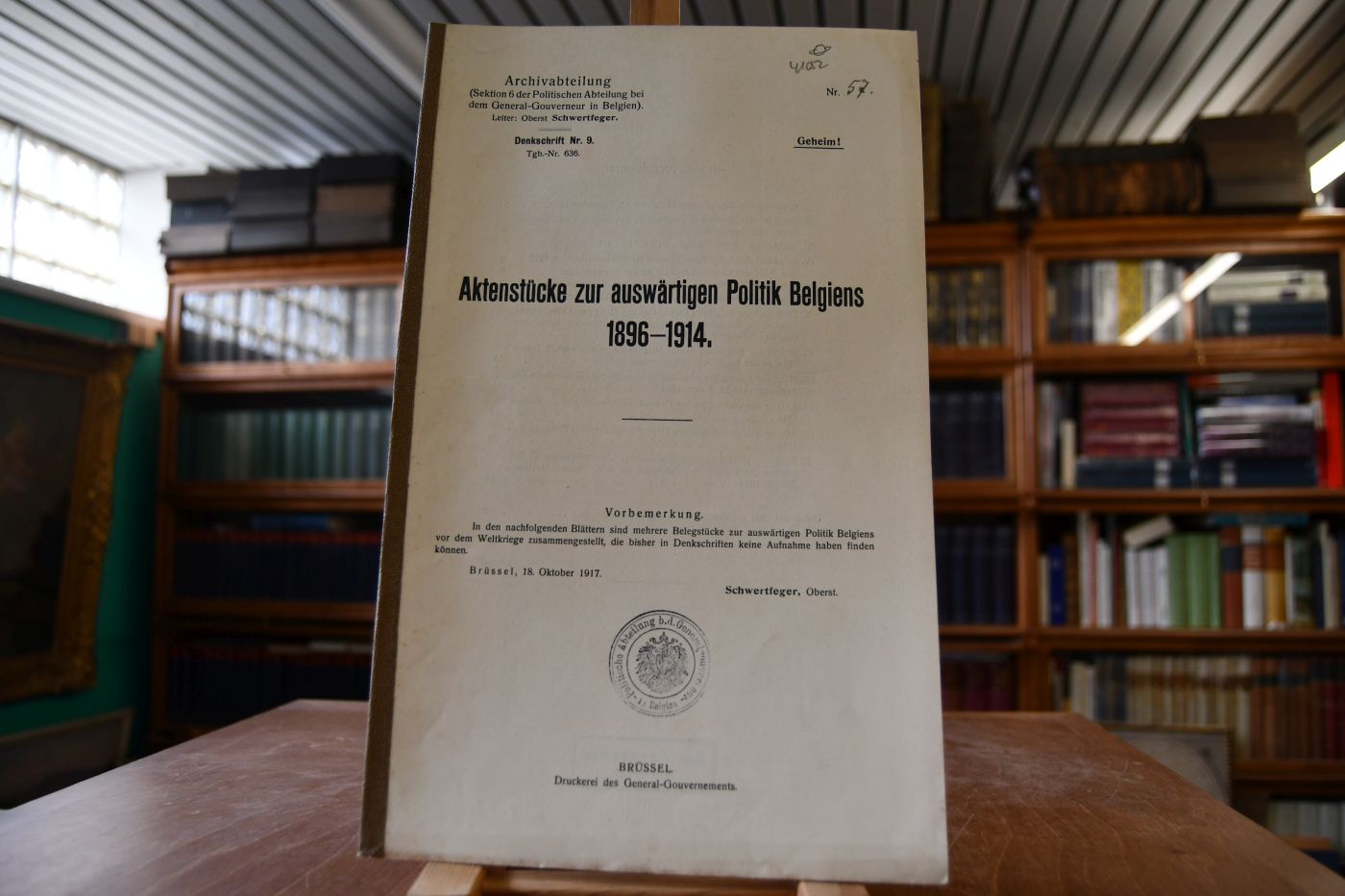 Archivabteilung (Sektion 6) der Politischen Abteilung bei dem General-Gouverneur in Belgien. Leiter: Oberst Schwertfeger. Denkschrift Nr. 9. Tgb.-Nr. 636.