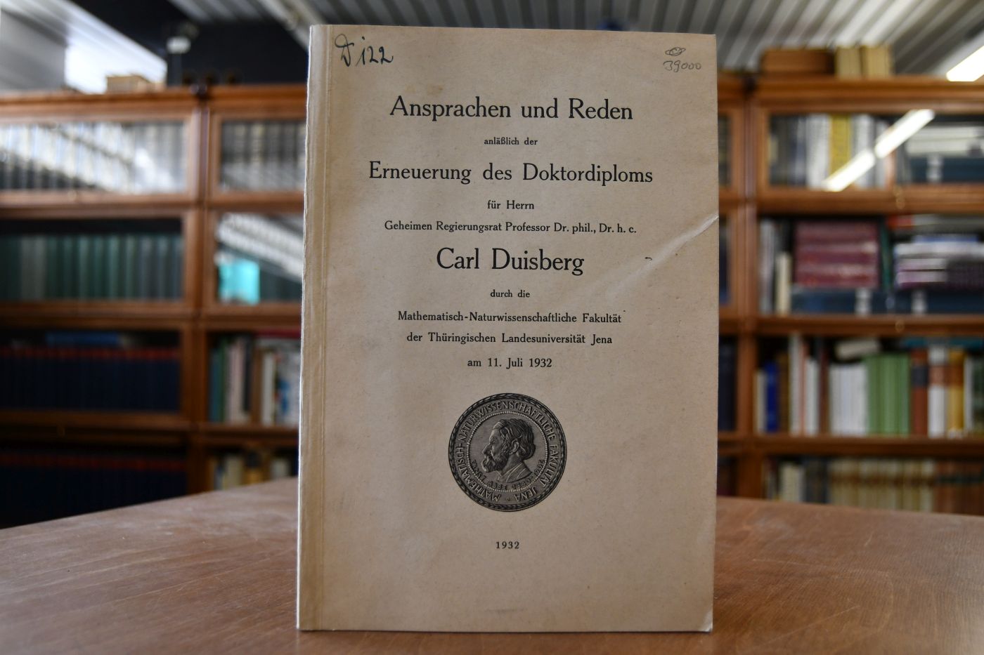 Ansprachen und Reden anläßlich der Erneuerung des Doktordiploms für Herrn Geheimen Regierungsrat Professor Dr. phil., Dr. h.c. Carl Duisberg durch die Mathematisch-Naturwissenschaftliche Fakultät der Thüringischen Landesuniversität Jena am 11. Juli 1932.