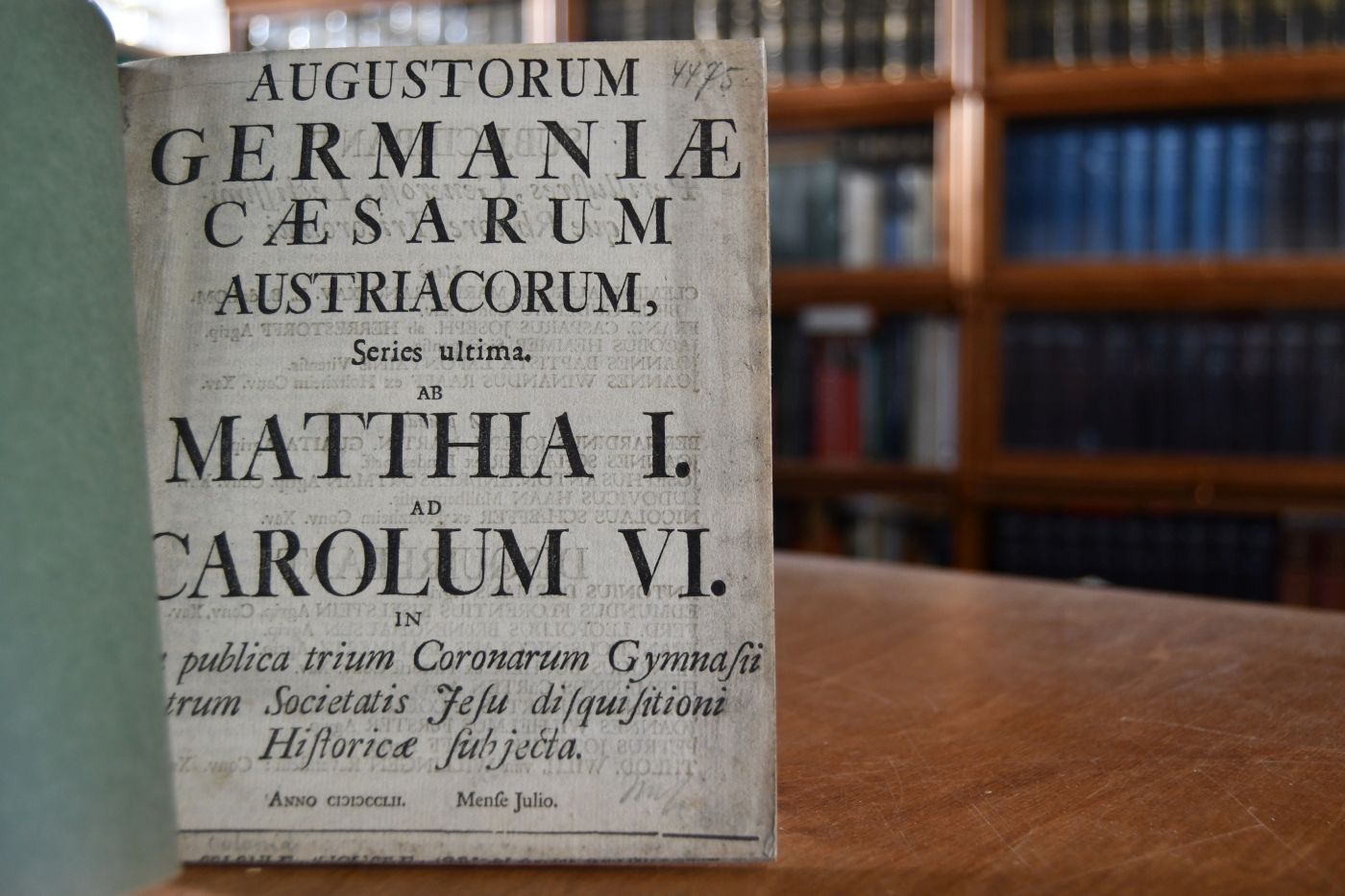 Augustorum Germaniae Caesarum Austriacorum, series ultima Ab Matthia I. ad Carolum VI. in Aula publica trium Coronarum Gymnasii Patrum Societatis Jesu disquisitioni Historicae subjecta. Mense Julio.
