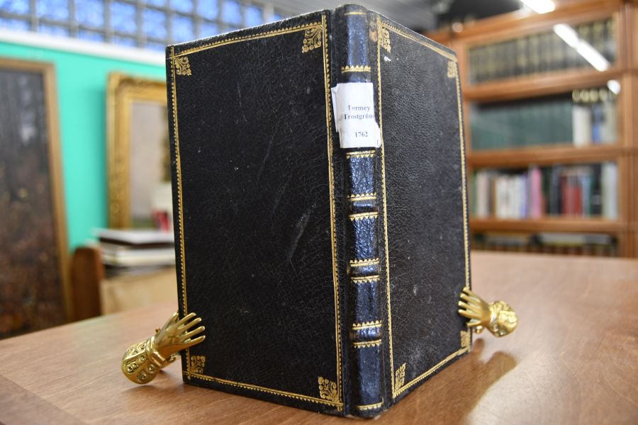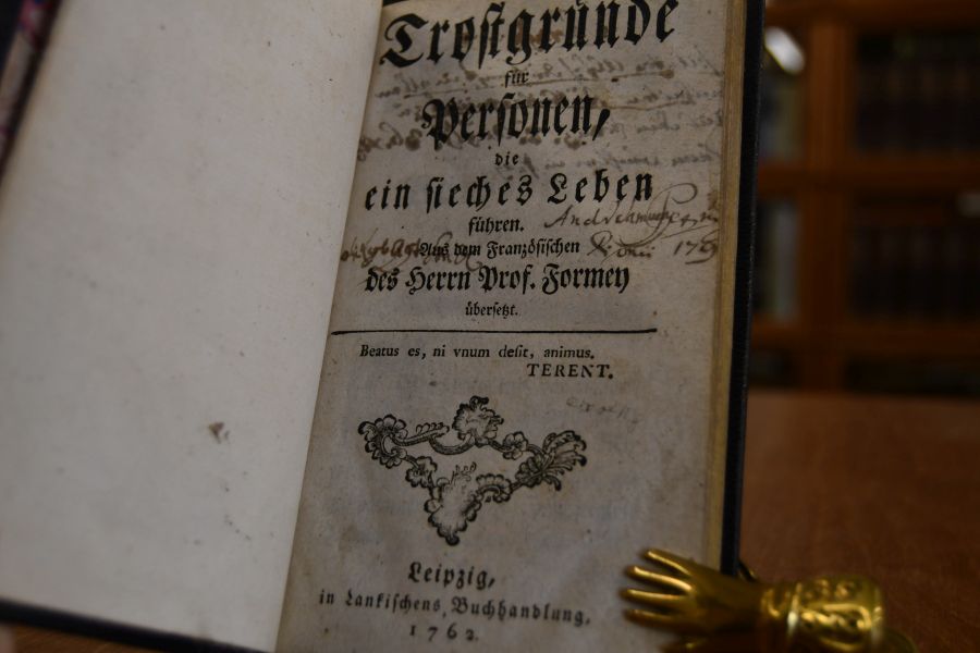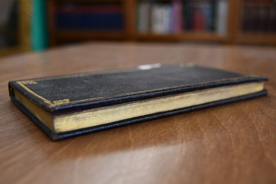 Format 18 x 11 cm, Leder der Zeit mit 5 Bünden, unschöner neueren Rückenbeschriftung und umlaufendem, stumpfem Goldschnitt