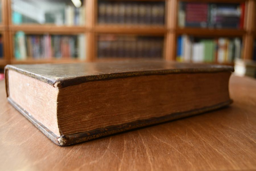 Format 26 x 20 cm, Leder auf fünf Bünden mit Rückenschild und -vergoldung, Stegrandvergoldung und umlaufendem Farbschnitt