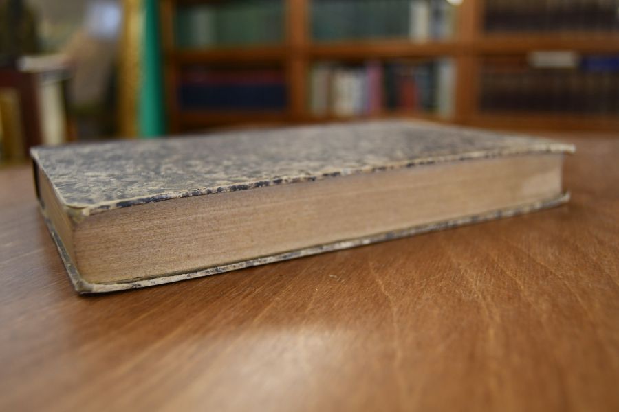 Beschreibung Einband berieben, bestoßen und mit etwas Verlust des Überzugpapiers. Durchgehend fleckig und am Anfang feuchtigkeitsrandig. Handfschriftlicher Besitzereintrag auf vorderem Spiegel.