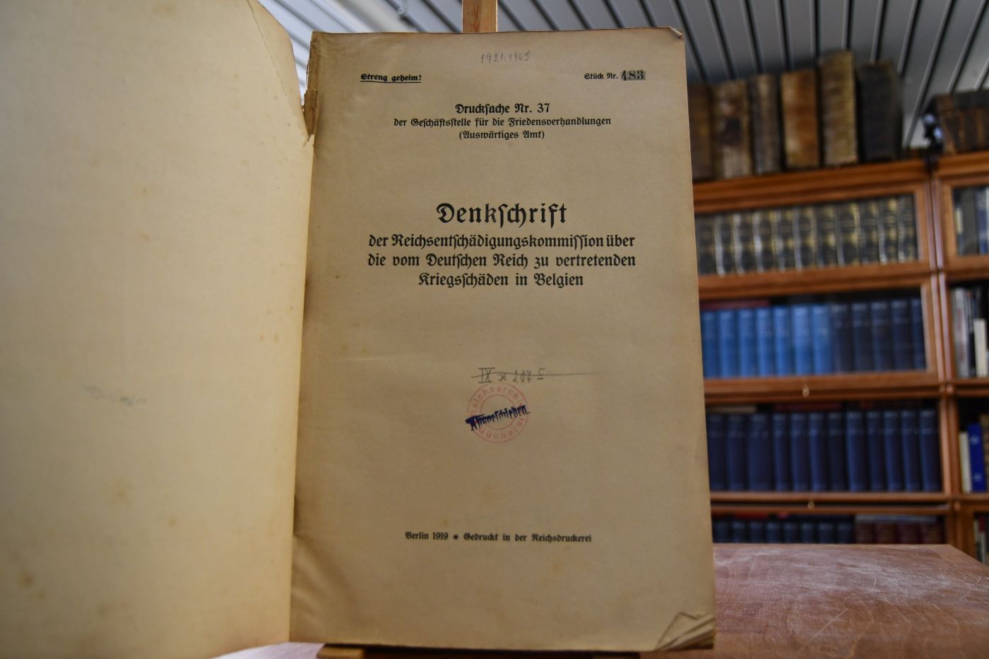 Beschreibung Einband berieben, bestoßen, angeschmutzt, mit Einrissen und fleckig. Rückdeckel lose, Rücken mit Verlust. Mit aufgeklebter Aktennummer des Reichsarchivs auf dem Vorderdeckel. Teilweise eselsohrig. Papierbedingt gebräunt. Das Exemplar ist als "Streng geheim!" gekennzeichnet.