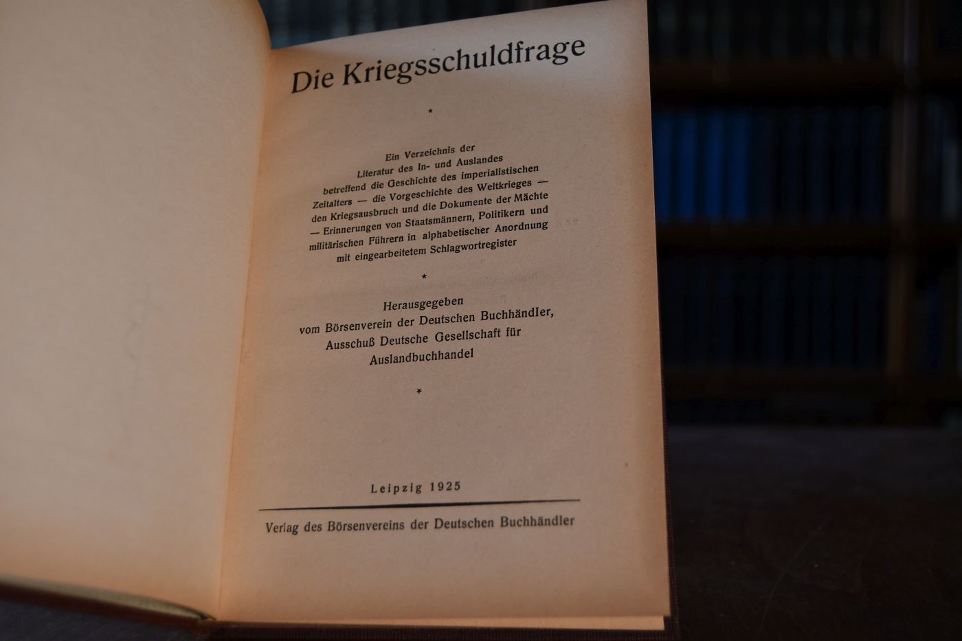 Die Kriegsschuldfrage. Ein Verzeichnis der Literatur des In- und Auslandes betreffend die Geschichte des imperialistischen Zeitalters - die Vorgeschichte des Weltkrieges - den Kriegsausbruch und die Dokumente der Mächte - Erinnerungen von Staatsmännern, Politikern und militärischen Führern in alphabetischer Anordnung mit eingearbeitetem Schlagwortregister.