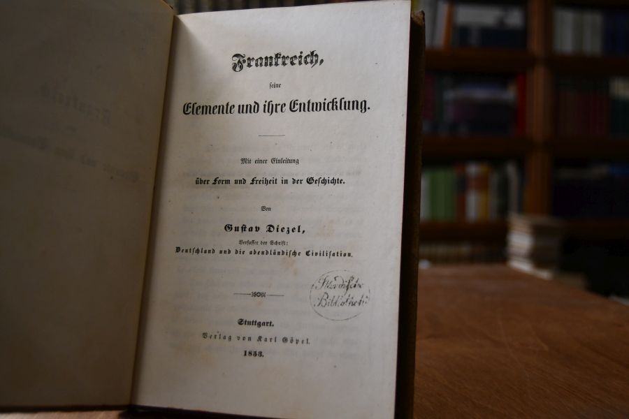 Beschreibung Einband berieben und bestoßen. Bibliotheksexemplar (Ständische Bibliothek [Stuttgart]) mit den üblichen Stempeln. Handschriftliche Bleistiftnotizen zum Inhalt des Buches auf fliegendem Vorsatz. Einige Bleistiftanstreichungen. Innen sauber und gut. "Diezel, Gustav Publizist und Politiker, * 27.10.1817 Nassau (Württemberg), † 1.8.1858 Norderney. (evangelisch). D. wandte sich, nachdem er das Tübinger Stift durchlaufen und kurze Zeit ein geistliches Amt versehen hatte, der Journalistik zu. 1848 trennte er sich zu Nürnberg von dem liberalen „Korrespondent“, gründete den „Freien Staatsbürger“ und wurde der Führer einer kleinbürgerlich-demokratischen Aktionspartei Er geriet mit den Behörden in Konflikt, floh in die Schweiz und richtete von dort maßlose Angriffe gegen die bayerische Regierung. Nach ernüchternden Erfahrungen im Exil stellte er sich dem Augsburger Schwurgericht und wurde wegen Majestätsbeleidigung zu 18 Monaten Gefängnis verurteilt. D. nützte die Haftzeit zu eifriger Fortbildung. Seit 1852 trat er mit vielgelesenen Veröffentlichungen in die Reihe der ersten Publizisten des damaligen Deutschland. Er ging aus von dem germanisch-romanischen Gegensatz, den er philosophisch vertiefte und politisch in scharfem Kampf gegen Bonapartismus, Ultramontanismus und die österreichische Reaktion einer Lösung zuführen zu können glaubte. Frühzeitig erkannte er die Bedeutung der russischen Macht für die künftigen Geschicke Europas. Bezeichnend für die ganze Generation des Publizisten war D.s Entwicklung vom Doktrinär und Idealpolitiker zum politischen Realisten. Bei aller taktischen Wendigkeit behielt er aber als Hochziel stets die nationale Einigung Deutschlands im Auge. Schließlich suchte er im deutschen Liberalismus Verständnis für die Wichtigkeit und die Aussichten Österreichs und für die positive politische Bedeutung der katholischen Kirche zu erwecken. Ansätze zu einer Parteigründung in Württemberg scheiterten. Für die deutschen Regierungen blieb D. der gebrandmarkte Revolutionär von 1848. Nur Herzog Ernst II. von Sachsen-Coburg, dessen Bruder, Prinzgemahl Albert, D.s außenpolitische Auffassungen ebenfalls zu schätzen wußte, nahm ihn in seinen Schutz. In schwerem Existenzkampf hat sich D. frühzeitig aufgerieben." (Gollwitzer, Heinz, "Diezel, Gustav" in: Neue Deutsche Biographie 3 (1957), S. 713 f. [Online-Version]