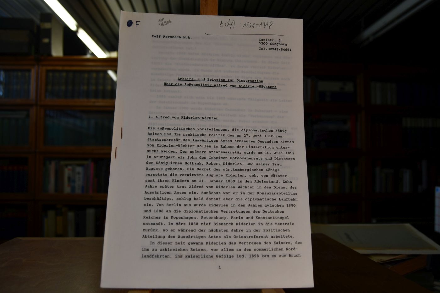 Arbeits- und Zeitplan zur Dissertation über die Außenpolitik Alfred von Kiderlen-Wächters.