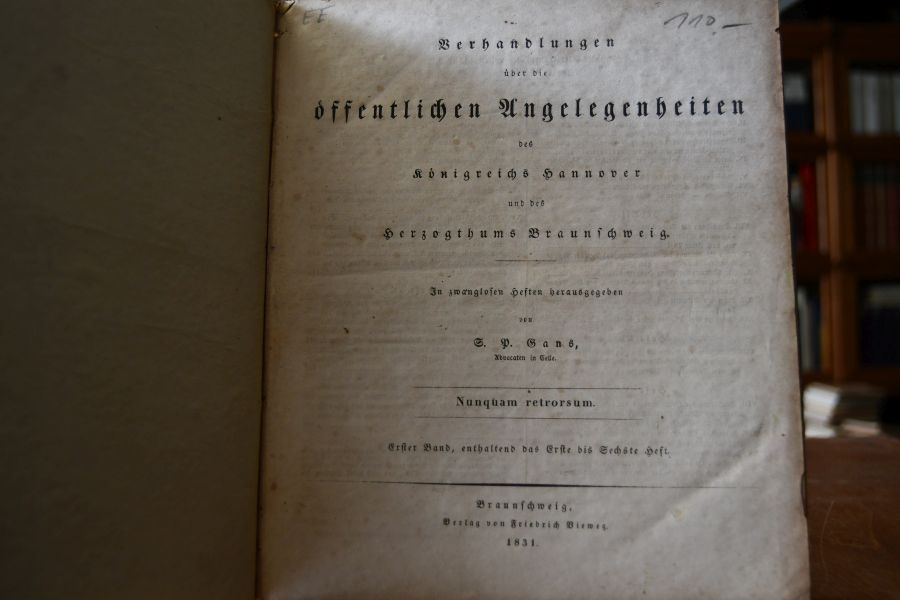 Verhandlungen über die öffentlichen Angelegenheiten des Königreichs Hannover und des Herzogthums Braunschweig. in zwanglosen Heften herausgegeben. Erster Band Heft 2-6 (fälschlicherweise wurde Heft 1 des 2. Bandes als Heft 1 des 1. Bandes eingebunden, deshalb auch abweichende Seitenzahlen).