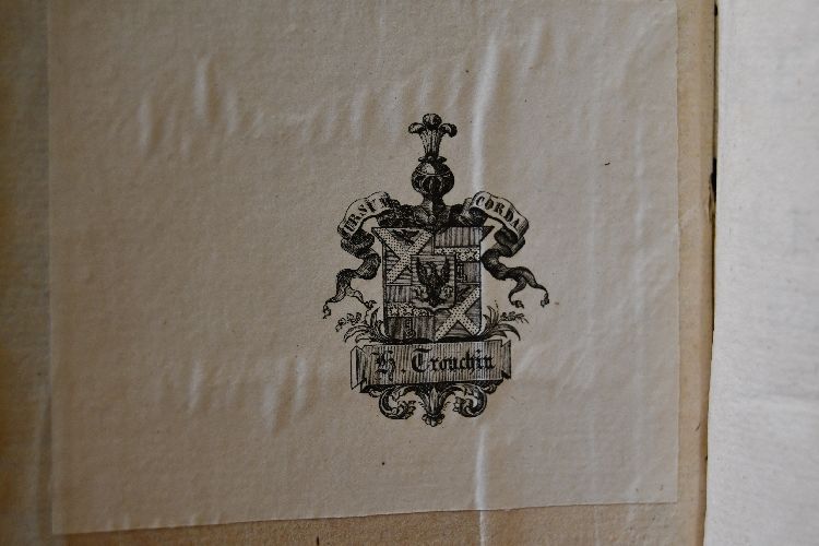 Format 20 x 12 cm, Pappband der Zeit mit handschriftlichem Besitzereintrag (Jacob Trouchin) auf dem Titel und Wappenexlibris (H. Trouchin) auf Innendeckel