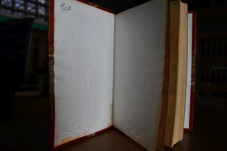 Format 21 x 14 cm, privates Halbleinen mit Rückenvergoldung und Kopffarbschnitt sowie eigebundenen Broschurdeckeln