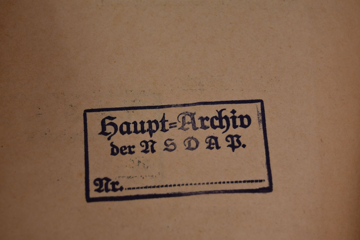 Beschreibung Einband lose, angeschmutzt, fleckig, mit Einrissen und Verlust. Schnitt fleckig. Papierbedingt gebräunt. Eselsohrig. Besitzerstempel (Haupt-Archiv der N.S.D.A.P.) auf Innendeckel und Titel (N.S.D.A.P. Parteiarchiv).