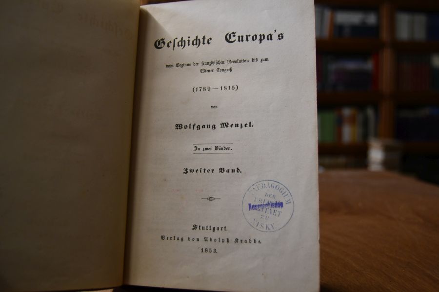 Beschreibung Einband berieben und bestoßen. Bibliotheksband (Paedagogium der Brüderuniversität zu Nisky) mit den üblichen Stempeln und Eintragungen. Gelegentlich etwas fleckig. "Wolfgang Menzel (* 21. Juni 1798 in Waldenburg (heute polnisch Walbrzych), Schlesien; † 23. April 1873 in Stuttgart) war ein deutscher Literaturkritiker, Literaturhistoriker und Schriftsteller im Vormärz. Ihm wird der berühmte Spruch von den Dichtern und Denkern, den er 1828 veröffentlicht hat, zugeschrieben. Wolfgang Menzel, evangelisch getaufter Sohn eines Arztes, wirkte in den Befreiungskriegen gegen Napoleon mit. 1817 machte er das Abitur in Breslau. Von 1818 bis 1820 studierte er Geschichte, Philosophie und Literatur an den Universitäten in Jena und Bonn. Während seines Studiums wurde er 1818/19 Mitglied der Urburschenschaft und war 1819 Mitgründer der Alten Bonner Burschenschaft. Er war ein Freund von Karl Ludwig Sand und Heinrich Heine. 1820 floh Wolfgang Menzel in die Schweiz, da er wegen seiner Umtriebe in der Burschenschaftsbewegung verfolgt wurde. Von 1820 bis 1824 war er Lehrer in Aarau und ging 1824 nach Heidelberg. Ab 1825 war er Redakteur des Literatur-Blattes zu Cottas Morgenblatt für gebildete Stände in Stuttgart. Dort startete er im Herbst 1835 eine Rezensions-Kampagne u. a. gegen Karl Gutzkow, den er 1831 als Mitarbeiter nach Stuttgart geholt und der sich inzwischen von ihm distanziert hatte. Vor allem seine aggressiv vorgetragenen Vorwürfe moralischer, religiöser und nationalistischer Art trugen entscheidend zu einem für die Geschichte der deutschen Literatur verheerenden Eingriff in das literarische Leben bei: dem Verbot des – auf diese Weise erst zur „Schule“ gewordenen – Jungen Deutschland. Sein wichtigstes Werk ist seine Literaturgeschichte, die in zwei Bänden zuerst 1828, überarbeitet 1836 als 2. vermehrte Auflage in vier Bänden erschien. Die erste Auflage war u. a. von größtem Einfluss auf den jungen Karl Gutzkow, dessen Mentor Menzel von 1830 bis 1834 war. Der außerordentlich streitbare und meinungsstarke Wolfgang Menzel galt wie sein Kritiker Ludwig Börne als einer der schärfsten Goethe-Gegner des Vormärz. Menzels ursprünglicher Liberalismus verwandelte sich mit der Zeit in einen völkisch orientierten Nationalismus. Von 1833 bis 1838 und von 1848 bis 1849 gehörte Menzel dem württembergischen Landtag an." (Wikipedia)