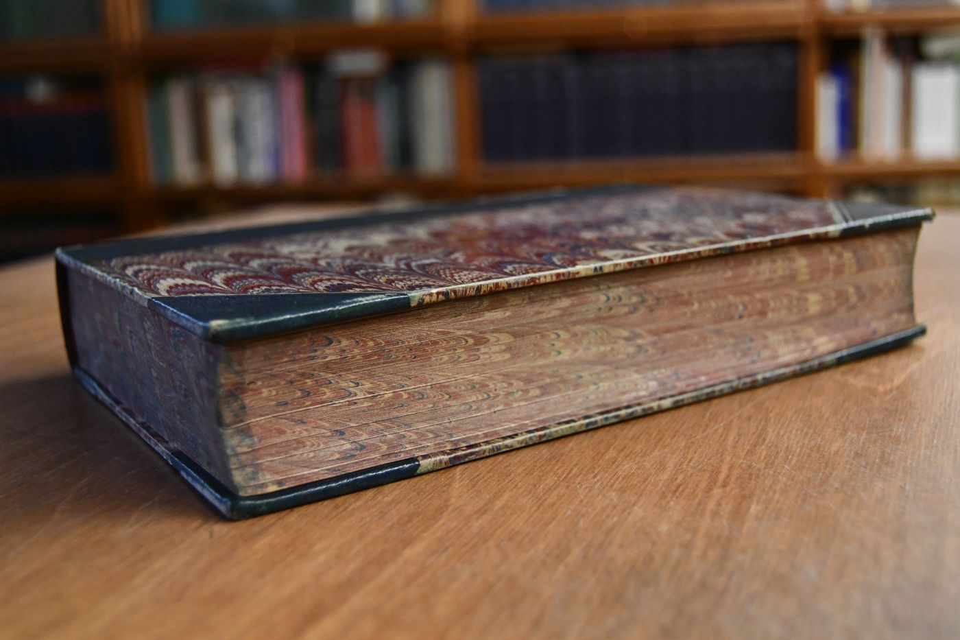 Format 23 x 16 cm, privates Halbleder mit 5 Bünden und umlaufenden marmorierten Schnitt.