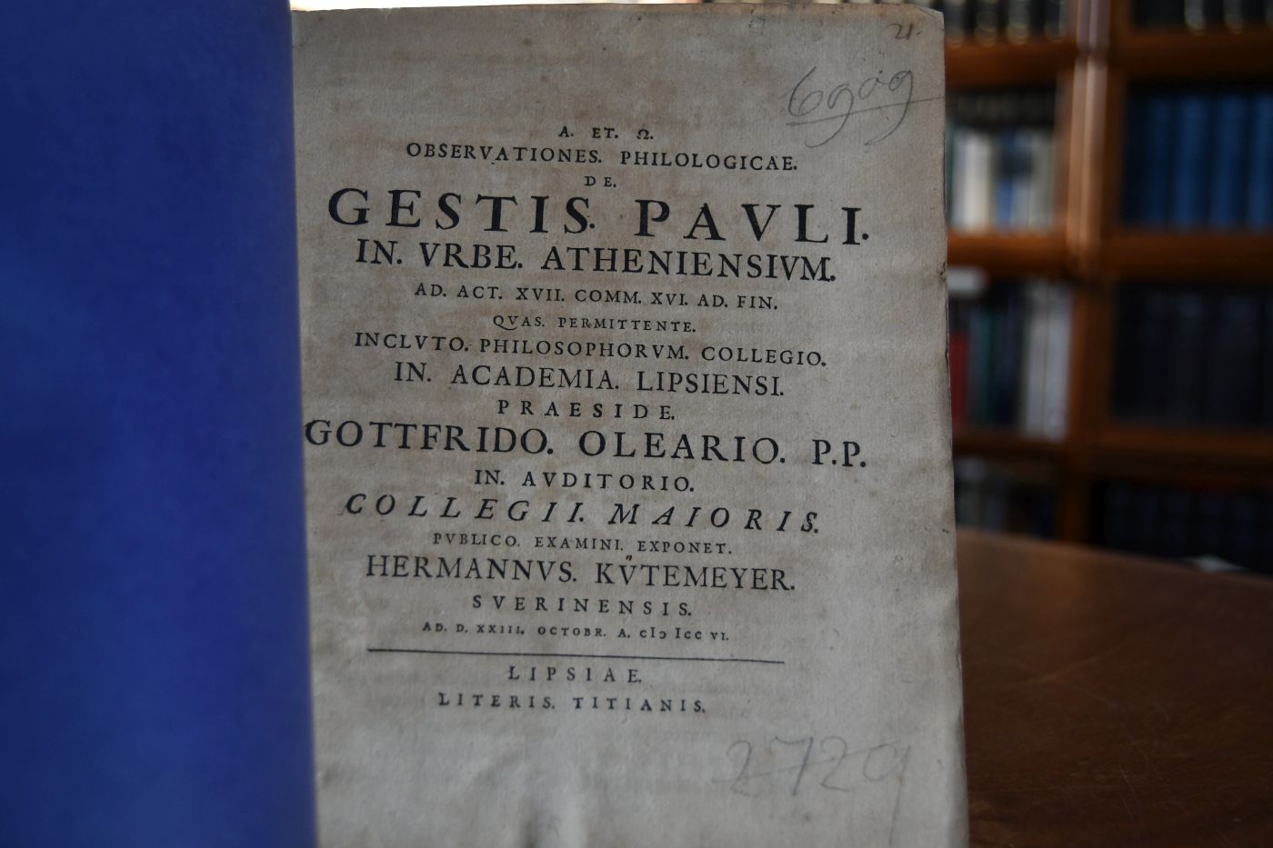 De Gestis Pavli In Vrbe Atheniensivm Observationes Philologicae ; Ad Act. XVII Comm. XVI Ad Fin. Qvas Permittente Inclvto Philosophorvm Collegio In Academia Lipsiensi Praeside Gottfrido Oleario. P.P. In Avditorio Collegii Maioris Pvblico Examini Exponet Hermannvs Kvtemeyer. Sverinensis.