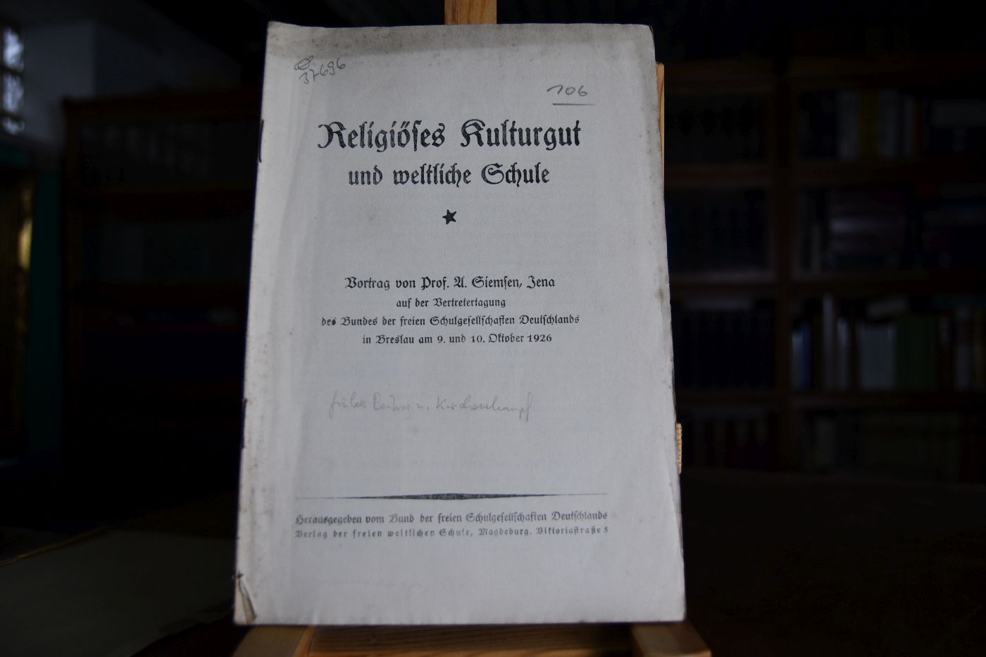 Religiöses Kulturgut und weltliche Schule. Vortrag auf der Vertretertagung des Bundes der freien Schulgesellschaften Deutschlands in Breslau am 9. und 10. Oktober 1926.