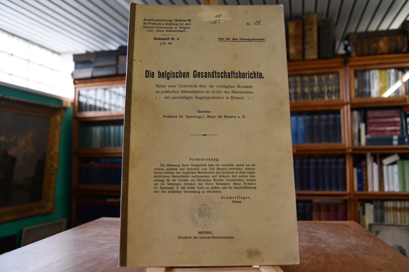 Archivabteilung (Sektion 6) der Politischen Abteilung bei dem General-Gouverneur in Belgien. Leiter: Oberst Schwertfeger. Denkschrift Nr. 6. J.-Nr. 381.