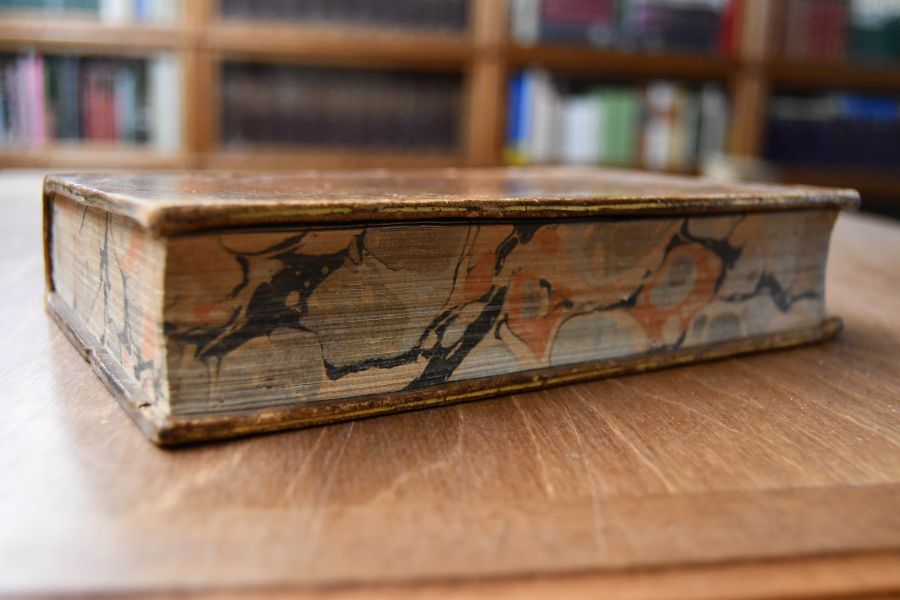 Format 21 x 14 cm, Leder mit 5 Bünden, 2 Rückenschilden, Rückenvergoldung und umlaufendem marmoriertren Schnitt