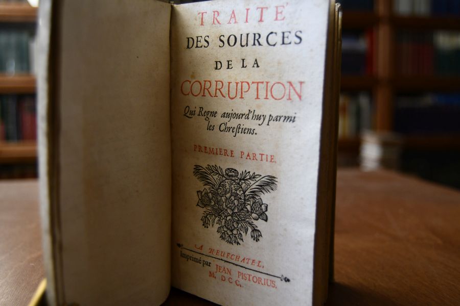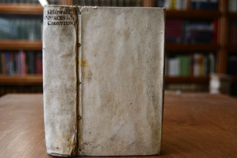 Beschreibung Einband berieben, bestoßen, schiefgelesen und am Rücken mit Einrissen. Durchegehend immer wieder etwas fleckig. Gestochenes Exlibris (Joh. Spöerlin) auf Innendeckel und handschriftlichem Besitzereintrag auf fliegendem Vorsatz. Mit handschriftlichen Gedanken und Informationen zum Buch auf Vorsatz. "Jean[-]Frédéric Ostervald (auch Johann Friedrich Osterwald; * 25. November 1663 in Neuenburg; † 14. April 1747 in Neuenburg) war ein reformierter Theologe aus der Schweiz. Nach einer Grundausbildung in Zürich und einem ersten akademischen Abschluss in Saumur studierte Ostervald Theologie in Orléans bei Claude Pajon (1626–1685), in Paris bei Jean Claude und in Genf bei Louis Tronchin (1629–1705). 1683 wurde er in seiner Heimatstadt zum Pfarrer ordiniert. Er gewann zu Lebzeiten einen großen Einfluss als Prediger, Seelsorger, Lehrer und Autor. Zusammen mit Jean-Alphonse Turrettini und Samuel Werenfels bildete er das sogenannte «theologische Triumvirat der Schweiz», das im Gegensatz zum strengen Calvinismus Gedanken der Aufklärung und des Pietismus vorbereitete. Theologisch zeigte er eine gewisse Neigung zum Sozinianismus und zum Arminianismus. Unter seinen zahlreichen Werken wurde vor allem seine Revision der Bibelübersetzung von Pierre-Robert Olivétan bekannt." (Wikipedia)