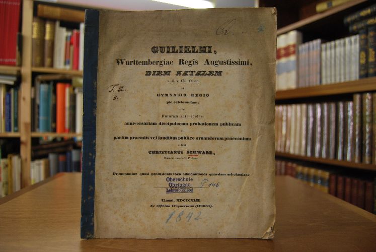 Guilielmi, Württembergiae Regis Augustissimi, Diem Natalem a.d.v. Cal. Octbr. in Gymnasio Regio pie celebrandum; item Futuram ante ibidem anniversariam discipulorum probationem publicam et partim praemiis vel laudibus publice ornandorum praeconium iudicit Christianus Schwarz, Gymnasii superioris Professor. Proponuntur quasi prolusionis loco admonitiones quaedem scholasticae.