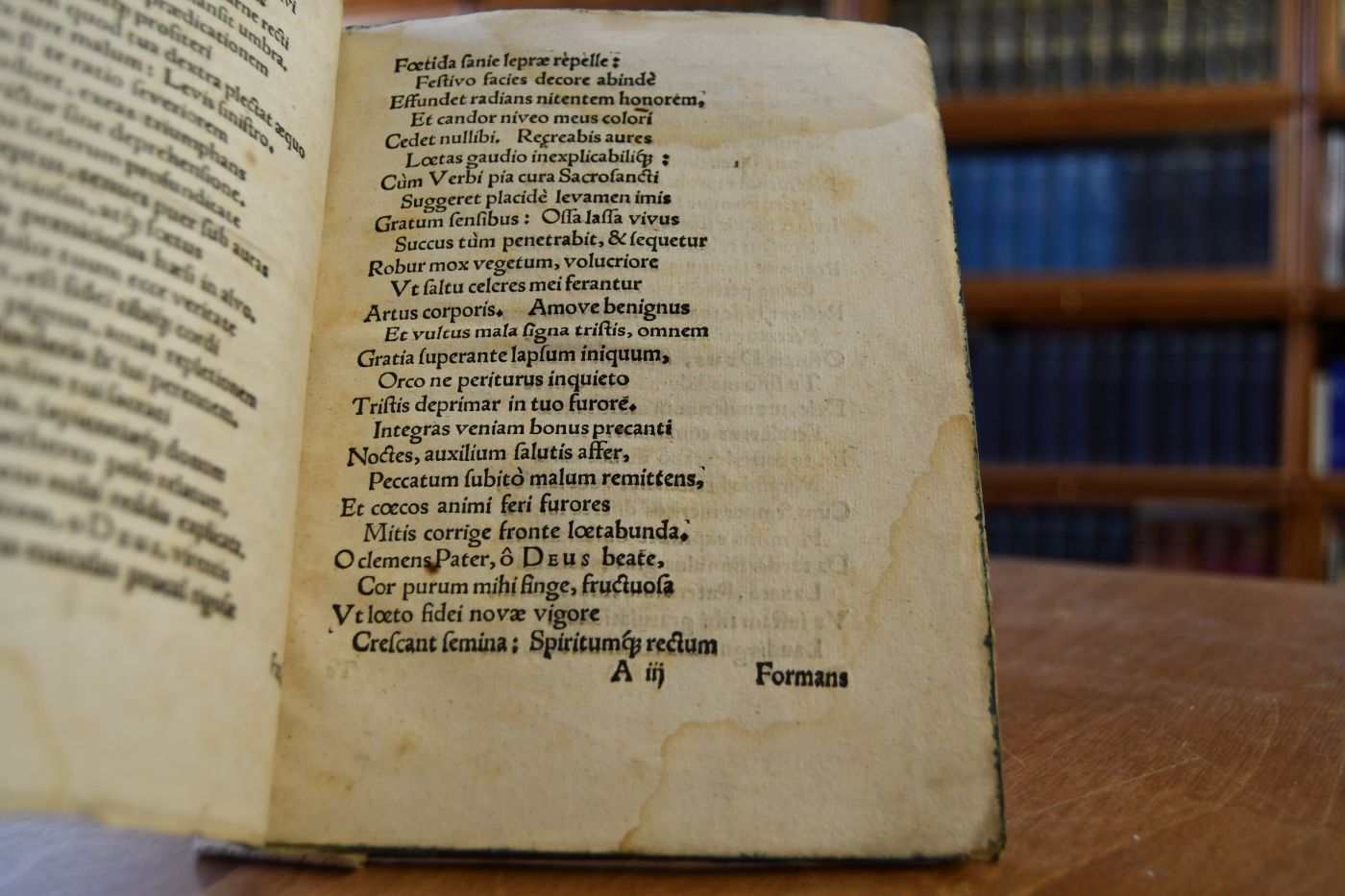 Beschreibung Einband berieben, bestoßen und angeschmutzt. Durchgehend fleckig und feuchtigkeitsrandig. Letztes Blatt mit co 10 x 2 cm Papierverlust am unteren Rand (ohne Textverlust). Auf Hinterdeckel eingeklebter Standortzettel. Von mir im KVK nicht nachweisbar.