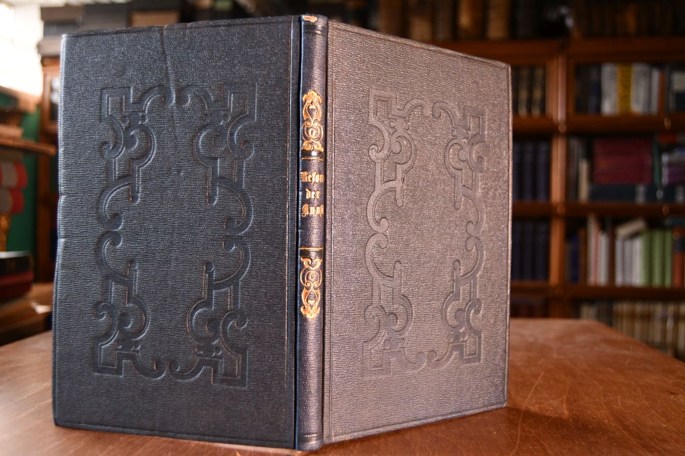 Format 22 x 15 cm, geprägtes Leinen mit etwas Rückenvergoldung und umlaufendem marmorierten Schnitt
