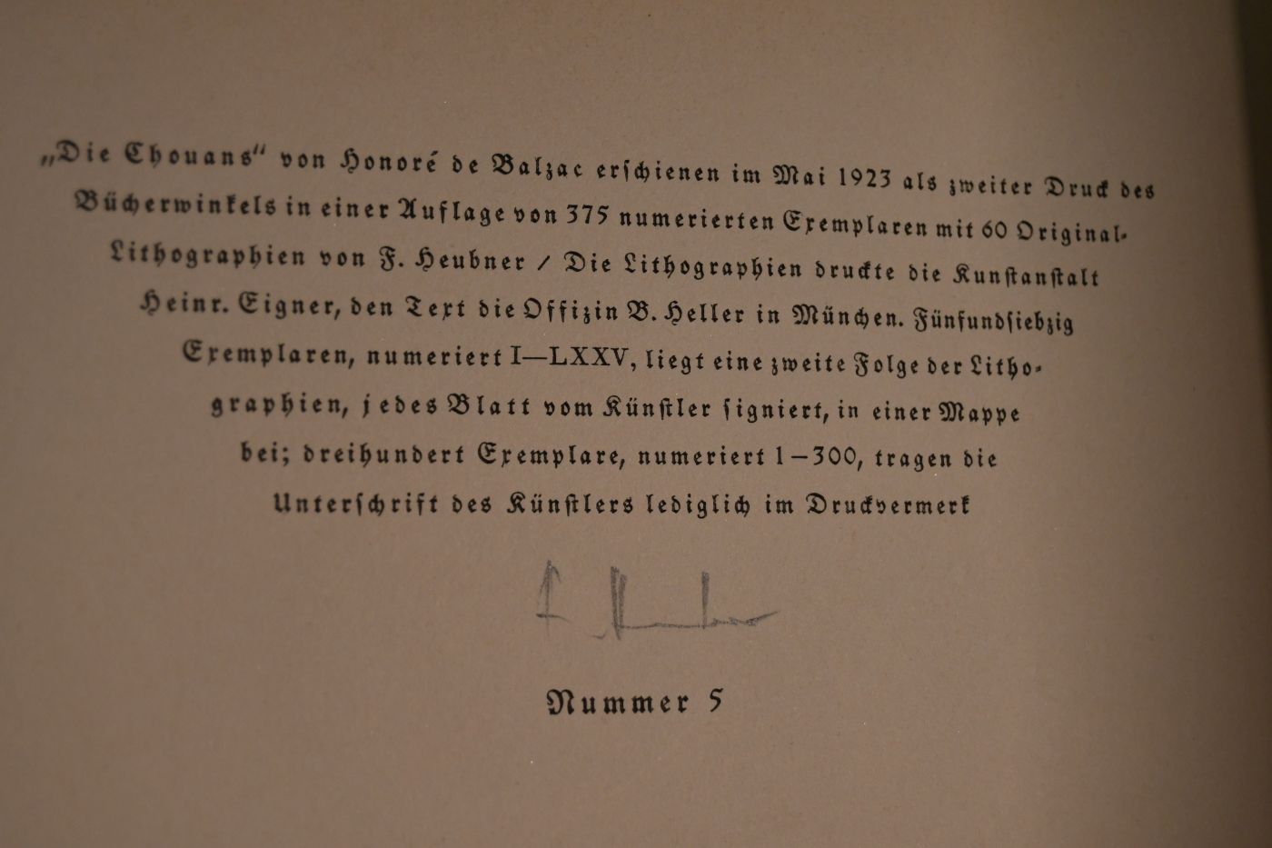 Auflage Zweiter Druck des Bücherwinkels in einer Auflage von 375 Ex. mit 60 Original-Lithographien von F. Heubner. Hier Nummer 5 von 300 Exemplaren der von F. Heubner signierten Normalausgabe.