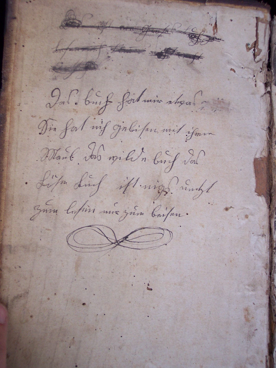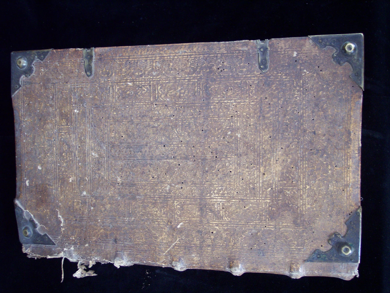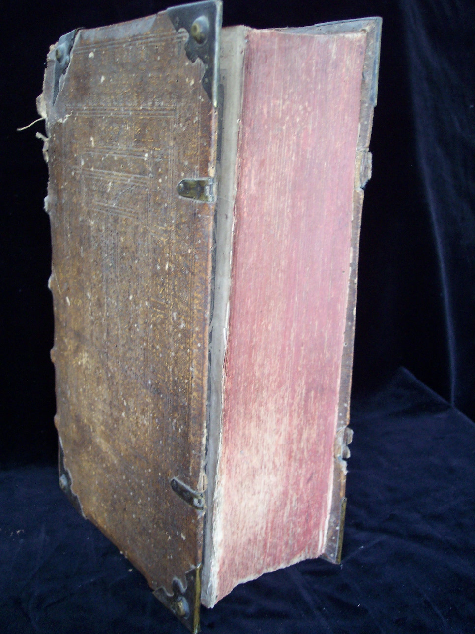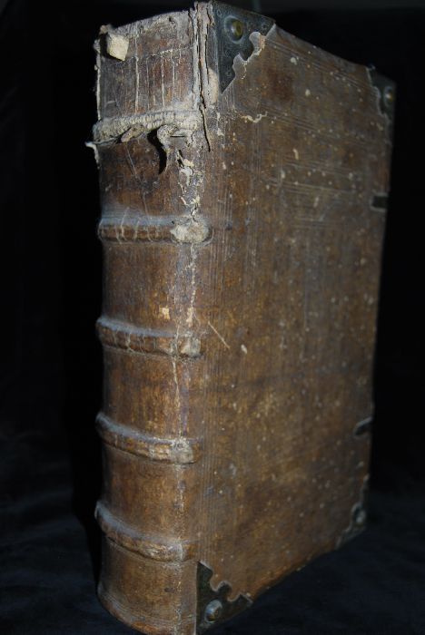 Format Folio (33,5 x 21 cm) Blindgeprägter Schweinslederband aus der Zeit über Holzdeckeln mit 8 geprägten Messingecken und 2 Schließen, die fehlen. Das Leder auf dem letzten von 5 Bünden fehlt bis zur Oberkante des Buchs (ca. 6,5 cm). Beide Deckel mit Wurmlöchern.