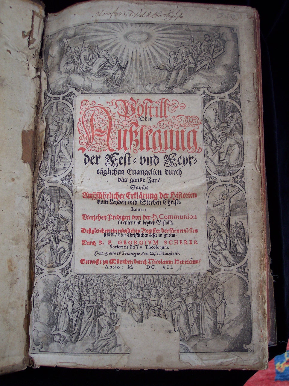 Beschreibung Auf Innenseite des Buchdeckels von alter Hand Eintragungen, die z.T. alt wieder ausgestrichen wurden. Lesbar ist:"Das Buch hat mir etwas .... Sie hat mich gebisen mit ihrem Maul das wilde Buch das böse Buch ist nigs nutzt zum lesen mir zum beisen" Auf Titelblatt handschriftlicher Besitzervermerk:"Monasterii SS. Vdal. et Afrae Augustae" damit gehörte dieses Buch einst in die Bibliothek des vor 1012 durch Kanoniker der Kirche St. Afra gegründeten Benediktinerklosters. Ab 1643/1644 bis zum Jahr 1802 war dieses Kloster Reichsabtei. Das Kloster wurde 1802 im Zuge der Säkularisierung aufgelöst. Die Stadt Augsburg und der Staat Bayern teilten sich den Besitz. 1805 wurden ein Militärspital und eine Kavalleriekaserne in der Klosteranlage eingerichtet. In diesem Zusammenhang gelangte wahrscheinlich auch dieses Buch in Privatbesitz. Mit Titelbordüre (Scherer), diese unten mittig mit ca. 4,5 x 4,5 cm Verlust, und 60 (teils kleinformatigen) Textholzschnitten. Mit geschnittenen Initialen und Vignetten. XX, 699 S. einige Seiten mit Einrissen, S. 39/40 mit teilweisem Verlust einer von 2 Spalten, durchgehender Holzwurmgang an Mittelsteg. Teilweise Einrisse und Holzwurmgänge. 60 teils kleinformatige Textholzschnitte in Renaissance-Bordüre. Davon 14 von Virgil Solis (1514 - 1562 Nürnberg) . Von diesen 14 sind S. 211 und S. 217 identisch, bei S. 190 und 199 ist der Holzschnitt identisch, aber die Bordüre unterschiedlich. Mit Titelbordüre (Eisengrein) und 25 (teils sich wiederholende) Texthoilzschnitte in Rollwerkkartuschen des Holzschneiders "HM". XXIV, 295 S.. SCHERER, Georg: Jesuitenpater und Prediger, 3.11.1540 in Schwaz im Unterinntal, 26.11.1605 in Linz a.d.D. - Sch. stammte aus einer Nordtiroler Familie mit 7 Kindern. Die Familie war sehr arm, aber ihre Gläubigkeit schuf die Basis für das spätere Ordensleben von Sch. 1559 trat er mit neun anderen jungen Männern ins Wiener Kollegium der Gesellschaft Jesu ein. Bald wurde er Hauptprediger und das Volk eilte zu seinen Morgenpredigten an jedem Sonntag. Er trat gegen alles Böse auf und behandelte vorab die Häresien "mit großer Würde und Autorität." Sehr wichtig war seine Tätigkeit als Hofprediger an der Hofburgkapelle zu Wien. Immer wieder hatte er die Erzherzöge Ernst, Matthias und Maximilian als Zuhörer. Dadurch trug Sch. sehr zur Festigung und Verteidigung des Katholizismus in den österreichischen Landen bei. Im Jahre 1580 machte er sich in seinen Predigten an die Widerlegung der Augsburger Konfession. Darüber entstanden wahre Tumulte und schließlich wurde ihm von höchster Stelle aufgetragen, über dieses Thema "unter einer anderen Form" zu handeln. Aus seinen gedruckten Kanzelreden erfahren wir, wie er selbst gegen Juden und Moslems polemisierte. Als Leiter des Kollegs in Wien hatte er eine weniger glückliche Hand, was ihm viel Feindschaften eingetragen hat. Seine Vorstellungen von Teufelsaustreibungen und Hexenwahn waren übertrieben, ja z. T. sogar direkt gefährlich. Zugleich aber gewann er viele Menschen zum katholischen Glauben zurück, der berühmteste unter ihnen war Melchior Klesl, der berühmte spätere Oberhirte in Wien. - Sch. machte sich auch einen Namen als Unterweiser und Berater von Predigern. Alles in allem, er war voll "ein Prediger wider die Zeit", ein typischer Vertreter der Kontroverspredigt und ein Vorläufer des ebenso berühmten Augustinerpaters Abraham a Sancta Clara. - Franz Loidl bemerkt über ihn: "Sein reiches Schrifttum zeigt heute noch gut, worum es in jener so leidenschaftlichen und befangenen Periode des Geisteslebens von der Mitte des l6. bis zur Mitte des 17. Jahrhunderts ging und wie die Gegensätze aufeinander prallten" (In: Geschichte des Erzbistums Wien... S. 64). Im Jahre 1600 wurde Sch. nach Linz a.d.D. berufen, wo der katholische Glaube nur mehr ganz vereinzelt lebte. 1605, nach anstrengender Tätigkeit starb Sch. an einem Schlaganfall, der ihn auf der Kanzel des alten Doms zu Linz ereilte. - Josef Wodka nennt Sch. den "bedeutendsten Jesuiten in Österreich neben Petrus Canisius" (In: Kirche in Österreich... S. 209). Seine Grabstätte fand Sch. im heutigen alten Dom in Linz direkt unter der Kanzel, von der aus er sooft gepredigt hatte. (Quelle: Bautz: Biographisch-Bibliographisches Kirchenlexikon, Band XXII (2003), Spalten 1213-1215 Autor: Ekkart Sauser). EISENGREIN, Martin: kath. Theologe und Polemiker, * 28.12. 1535 in Stuttgart als Sohn lutherischer Eltern, † 3.5. 1578 in Ingolstadt. - E. studierte in Tübingen, Ingolstadt und Wien und wurde dort 1555 Professor der Beredsamkeit und 1557 der Naturphilosophie. 1558 trat er zur katholischen Kirche über und studierte Theologie. E. wurde 1560 Domprediger in Wien, 1562 Pfarrer in Ingolstadt und 1564 Professor der Theologie, zugleich Propst von Moosburg und Altötting, 1568 Hofprediger Maximilians II. Da ihm das weltliche Leben am Hof nicht zusagte, kehrte er 1570 als Superintendent oder Inspektor der Universität nach Ingolstadt zurück. Als Gesandter des Herzogs von Bayern, Albrecht V., nahm E. 1563/64 in Wien an den Verhandlungen über Laienkelch und Priesterehe teil. 1566 sandte ihn der Herzog nach Rom, um für seinen Sohn Ernst als Bischof von Freising die päpstliche Bestätigung zu erwirken. E. war ein bedeutender Polemiker, Prediger und Volksschriftsteller und neben Johann Eck der eigentliche Führer der Gegenreformation in Bayern. (Quelle: Bautz: Biographisch-Bibliographisches Kirchenlexikon, Band I (1990)Spalte 1481 Autor: Friedrich Wilhelm Bautz ).
