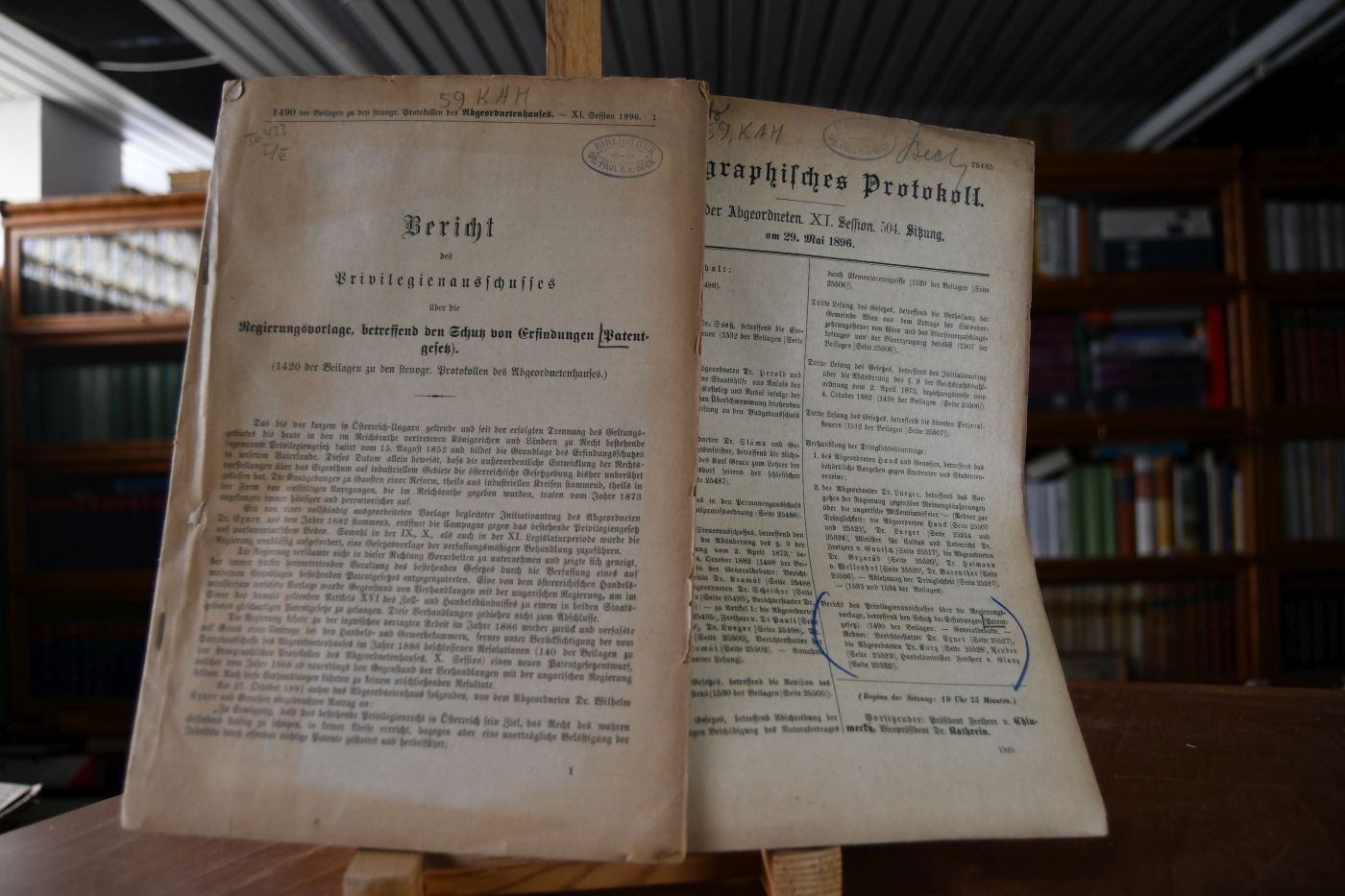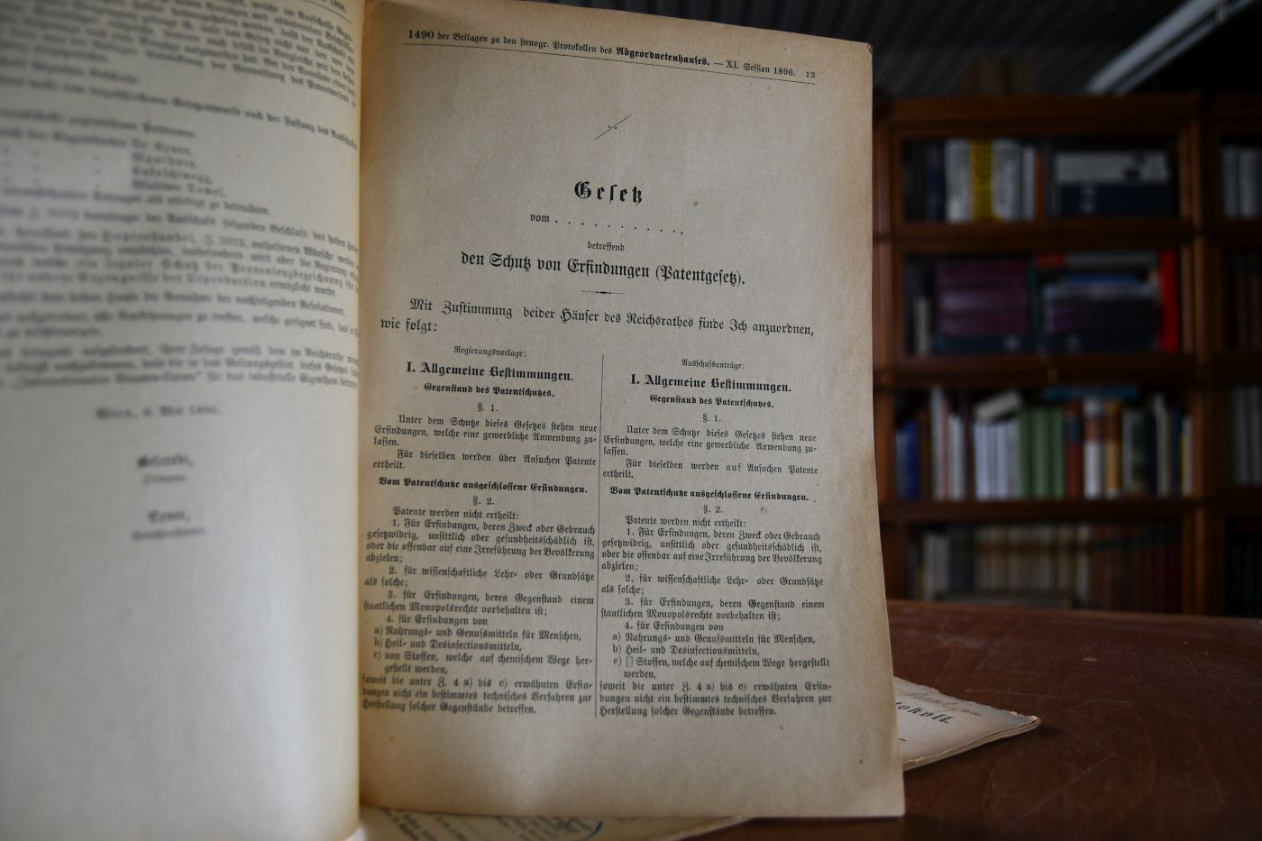 Bericht des Privilegienausschusses über die Regierungsvorlage, betreffend den Schutz von Erfindungen (Patentgesetz). 1490 der Beilagen zu den stenogr. Protokollen des Abgeordnetenhauses, XI. Session 1896. + Stenographisches Protokoll, Haus der Abgeordneten XI. Session, 504. Sitzung am 29. Mai 1896 (25485).