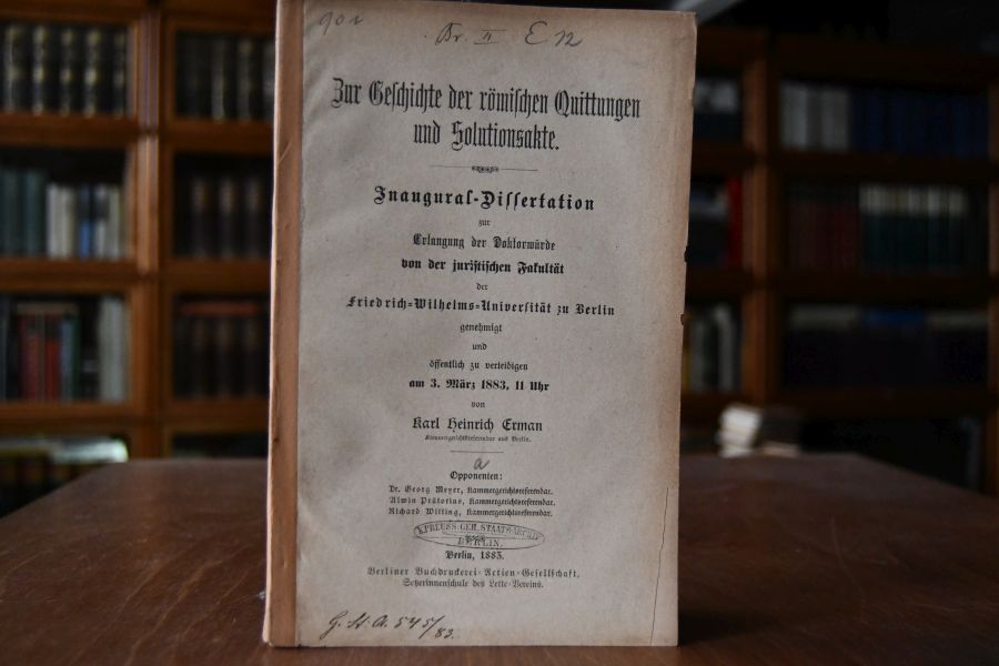 Beschreibung Einband berieben, bestoßen und gebräunt. Bibliotheksexemplar (K.Preuss.Geh.Staats-Archiv Berlin) mit den üblichen Stempeln und Eintragungen. Innen sauber. "Karl Heinrich Erman (* 15. Januar 1857 in Berlin; † 7. Mai 1940 in Münster) war ein deutscher Rechtswissenschaftler mit dem Forschungsschwerpunkt im Römischen Recht. Erman wurde 1857 als Sohn des Physikers und Professors an der Universität Berlin Georg Adolf Erman (1806–1877) in Berlin geboren. Seine Brüder waren der Bibliothekar Wilhelm Erman (1850–1932) und der Ägyptologe Adolf Erman (1854–1937). Sein Sohn war der Jurist und Begründer des gleichnamigen BGB-Kommentars Walter Erman (1904–1982). Er war mit der Enkelin Alexander Herzens verheiratet. Erman konnte auf eine Ahnenreihe von Akademikern zurückblicken, sein Urgroßvater war der Historiker und protestantische Theologe Jean Pierre Erman (1735–1814), seine Großväter der Berliner Physiker Berlin Paul Erman (1764–1851) sowie der Königsberger Astronom Friedrich Wilhelm Bessel (1784–1846). Wie alle seine Brüder war er Mitglied der Leipziger Burschenschaft Germania.[1][2] Heinrich Erman wurde nach seinem Studium an der Friedrich-Wilhelms-Universität zu Berlin bei Heinrich Dernburg mit einer Dissertationsschrift zur römischen Rechtsgeschichte mit dem Titel "Zur Geschichte der römischen Quittungen und Solutionsakte" promoviert. Ohne Habilitation wurde er im Jahre 1883 als Professor für römisches Recht an die schweizerische Université de Lausanne berufen. Dort hielt er seit dem Wintersemester 1883/84 Vorlesungen zum römischen Recht zunächst in französischer Sprache und ab dem Wintersemester 1886/87 an der sonst französischsprachigen Hochschule erstmals deutschsprachige Vorlesungen. Er ist Mitbegründer der Société d’Étudiants Germania Lausanne. Nachdem 1896 in Deutschland das BGB verabschiedet worden war (in Kraft getreten am 1. Januar 1900), hielt Erman ab 1897 Vorlesungen zum neuen deutschen Zivilrecht in Lausanne. Als Erman Lausanne 1902 nach 19 Jahren verließ, wurde auf seinen Antrag an der Universität zu Lausanne ein deutschsprachiger Lehrstuhl für Deutsches Recht eingerichtet, der bis heute besteht. Im Sommersemester 1902 wurde Erman an die neu gegründete Juristische Fakultät an der Universität Münster berufen, an der er von 1908 bis 1909 Rektor und von 1909 bis 1910 Prorektor gewesen ist. Bis zu seiner Emeritierung 1925 beschäftigte er sich dort vornehmlich mit der Bodenreform der Weimarer Reichsverfassung und verfasste dazu mehrere Schriften. Seit 1920 gehörte Erman zum engeren Vorstand des Bundes Deutscher Bodenreformer. Ab 1924 war er stellvertretender Vorsitzender. Nach seiner Emeritierung übernahm Erman 1928 noch einmal die Vorlesungen für deutsches und römisches Recht an der Universität zu Lausanne und kehrte 1933 nach Münster zurück, wo er im Mai 1940 verstarb. Erman war Ehrenmitglied des Akademisch-Juristischen Vereins Münster." (Wikipedia)