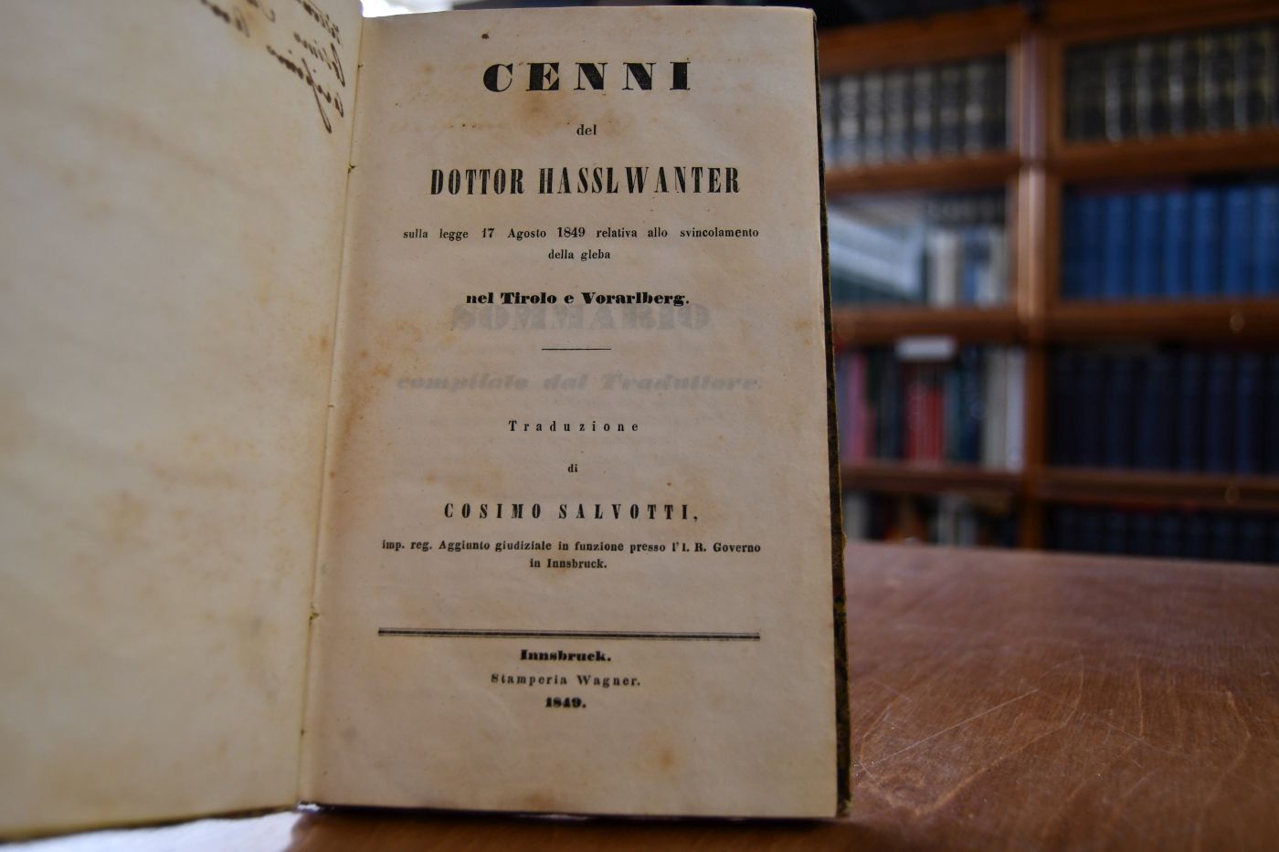 Cenni del Dottor Hasslwanter sulla legge 17 agosto 1849 relativa allo svincolamento della gleba nel Tirolo ne Vorarlberg.