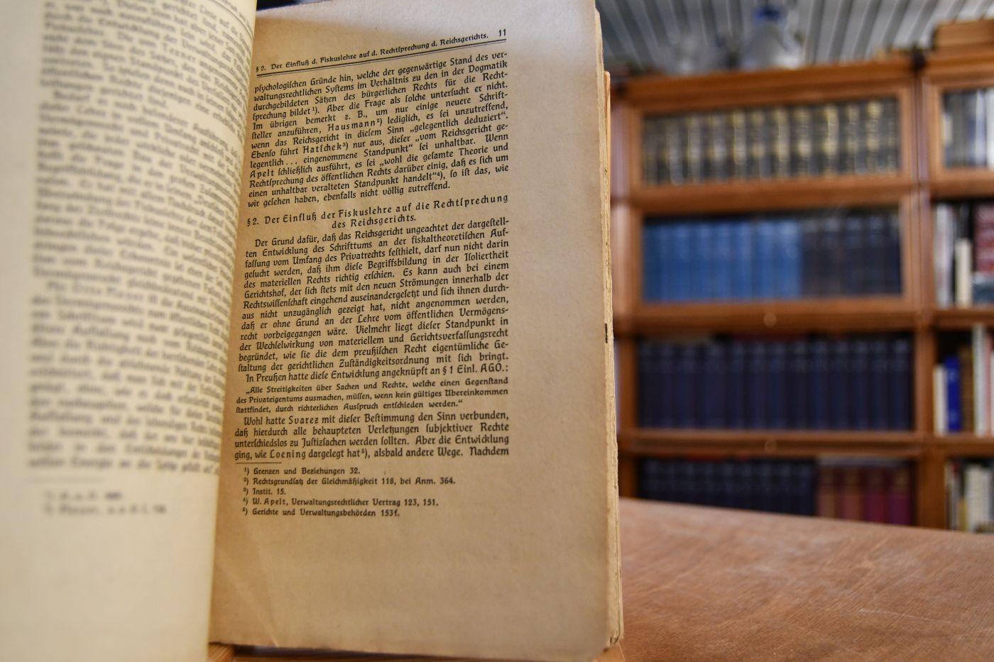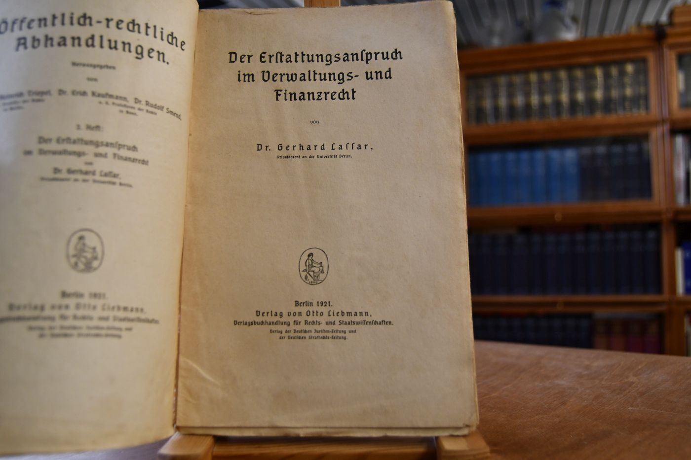 Beschreibung Einband berieben, bestoßen, fleckig und mit Einrissen. Rücken mit Verlust. Papierbedingt gebräunt. Einzelne Lagen lose. "Gerhard Oskar Lassar (* 16. Februar 1888 in Berlin; † 6. Januar 1936 ebenda) war ein deutscher Jurist. Gerhard Lassar war ein Sohn des Dermatologen Oskar Lassar und dessen Ehefrau Emma. Nach dem Abitur am Wilhelm-Gymnasium in Hamburg studierte er Rechtswissenschaften an der Universität Freiburg im Breisgau und der Universität Berlin und leistete zwischenzeitlich 1908/09 den Einjährig-Freiwilligendienst im Garde-Kürassier-Regiment ab. 1910 bewarb er sich mit „Die Vertragsstrafe nach dem Bürgerlichen Gesetzbuch“ bei der Paul-Schultze-Stiftung und erhielt dafür ein Preisstipendium. 1911 bestand er das erste juristische Staatsexamen. Lassar blieb an der Berliner Universität und forschte begleitend zum Referendariat bei Gerhard Anschütz. Ab dem 3. August 1914 kämpfte er als Soldat während des Ersten Weltkriegs. Nach einer Verletzung erhielt er Genesungsurlaub und reichte währenddessen im April 1918 seine Promotionsschrift „Die Grundbegriffe des preußischen Wegerechts“ bei Heinrich Triepel ein. Der Kriegsdienst endete am 13. November 1918. Die Habilitation bei Triepel über „Der Erstattungsanspruch im Verwaltungs- und Finanzrecht“ erfolgte zwei Jahre später. Beide Werke wurden 1919 bzw. 1921 als Bücher verlegt. Die Schriften brachten Lassar früh Ansehen in der Fachwelt ein und zeigten, dass er das öffentliche Recht reformieren wollte. Danach unterrichtete Lassar als Privatdozent und Lehrbeauftragter Verwaltungs-, Wirtschafts-, Steuer- und Strafrecht in Berlin. Ein Semester verbrachte er an der Universität Münster. 1924 erhielt er von der Berliner Universität einen Ruf als außerplanmäßiger außerordentlicher Professor. Außerdem arbeitete er von 1921 bis 1923 je ein Jahr ehrenamtlich als Referent im Reichswirtschaftsministerium und gegen Bezahlung als wissenschaftlicher Mitarbeiter im Reichsfinanzministerium. Lassar heiratete die ausgebildete Sängerin Margarete Küller und adoptierte 1922 das Waisenkind Herwarth (* 1916). Im April 1925 zog die Familie nach Hamburg, wo Lassar bis 1933 an der dortigen Universität einen neu eingerichteten Lehrstuhl für Öffentliches Recht übernahm. Zu den Kollegen Lassars, der in Harvestehude lebte, gehörten Kurt Perels und Rudolf Laun. An der Hamburger Universität lehrte er zum besonderen Teil des Verwaltungsrechts, Arbeits- und Steuerrecht. Zu seinem Spezialgebiet entwickelte er englisches Recht. 1926 und 1928 verbrachte er dank Stipendien des Reichsjustizministeriums längere Zeit zu Forschungszwecken in Großbritannien. Während der Zeit in Hamburg forschte und publizierte Lassar umfangreich. Er schrieb Beiträge für Jahrbücher, kommentierte das Allgemeine Polizeirecht und befasste sich im „Handbuch des deutschen Staatsrechts“ 1930 mit den Zuständigkeiten von Reich und Ländern. Lassar beteiligte sich intensiv an Überlegungen zur Reichsreform und zur Studienreform für Juristen. Er gab das Verwaltungsarchiv und das Reichsverwaltungsblatt mit heraus und erarbeitete mit Bill Drews eine Neuausgabe der „Verwaltungsgesetze für Preußen“. Von 1926 bis 1933 übernahm er die Studienleitung der Hamburger Verwaltungsakademie. 1930 erhielt Lassar einen Ruf auf den Lehrstuhl für Öffentliches Recht der Universität Greifswald. Die Hamburger Universität antwortete darauf mit dem Vorschlag, die bisher außerordentliche zu einer ordentlichen Professur aufzustocken. Lassar nahm beide Angebote nicht an. Die Gehaltserhöhung in Hamburg lehnte er ab, da er sie aufgrund der wirtschaftlichen Umstände für unverantwortlich hielt. Lassar, der bei der Reichsreform mit Bürgermeister Carl Petersen kooperierte, der DStP angehörte und seit Mitte der 1920er Jahre eine enge Freundschaft mit Hans von Dohnanyi pflegte, positionierte sich Anfang der 1930er Jahre öffentlich gegen aufkommende radikale und polarisierende Tendenzen und die Nationalsozialisten. Am 5. Dezember 1930 referierte er für die juristische Fachschaft der Universität über Reformen des juristischen Studiums und die Anforderungen, die an angehende Beamte zu stellen seien. Dabei sagte er, dass Deutschland drohe, gespalten zu werden und forderte dazu auf, die Verfassung der Weimarer Republik und deren demokratisches Prinzip als einigendes Element anzusehen. Er forderte nachdrücklich, Personen mit nationalsozialistischer Gesinnung zwar juristische Berufe ausüben zu lassen, sie jedoch keinesfalls staatlich zu beschäftigen. Im Januar und Februar 1933 referierte Lassar bei vier öffentlichen Veranstaltungen im zweitgrößten Hörsaal im Universitätshauptgebäude über „Verfassung und Verfassungsreform“. Da ihn die Nationalsozialisten nach der Machtergreifung als „Nichtarier“ einstuften, stand Lassar im Sommersemester 1933 vor der Entlassung aufgrund des Gesetzes zur Wiederherstellung des Berufsbeamtentums. Während einer Vorlesung zum Arbeitsrecht im Juli desselben Jahres organisierte sein Doktorand Arnold Köster eine Solidaritätskundgebung, die jedoch nicht half: im September 1933 kündigten die Nationalsozialisten Lassar „zur Vereinfachung der Verwaltung“, de facto jedoch rassistisch motiviert, zum Jahresende. Dabei wendeten sie eine gesetzliche Ausnahmeregelung, die aufgrund vielfacher Auszeichnungen als Offizier während des Ersten Weltkriegs die Versetzung in den Zwangsruhestand hätte verzögern können, nicht an. Lassar ging daraufhin nach Berlin, wo er jedoch keine Aussicht auf eine neue Stelle hatte. 1935 traf er in England seinen Freund Harold Laski und wohnte einige Zeit bei seinem beurlaubten ehemaligen Doktoranden und Gerichtsreferendar Köster. Beide rieten ihm, das Deutsche Reich dauerhaft zu verlassen. Auch wenn er möglicherweise eine befristete Stelle in England hätte erhalten können, vergiftete sich Lassar Anfang 1936 selbst. Zu diesem Zeitpunkt muss er gewusst haben, dass er damit seine Frau und