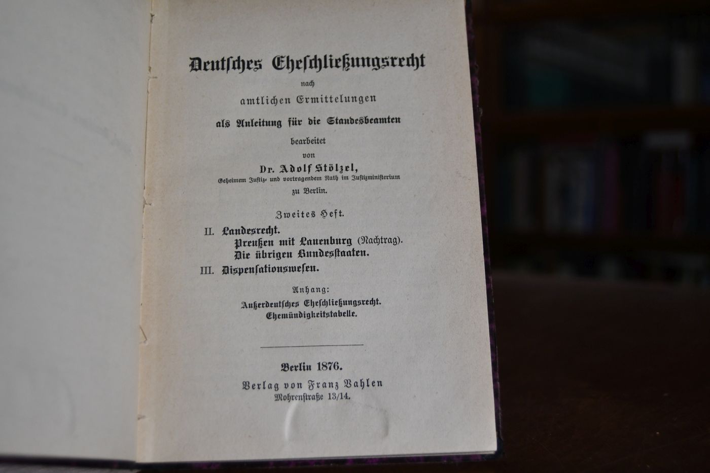 Beschreibung Einband berieben und bestoßen. Bibliotheksexemplar (Koen. Preuss. Amtsgericht Haigerloch) mit den üblichen Stempeln, Eintragungen und Aufklebern. "Adolf Stölzel (* 28. Juni 1831 in Gotha; † 19. April 1919 in Berlin) war ein deutscher Rechts- und Geschichtswissenschaftler. Als Kronsyndikus saß er im Preußischen Herrenhaus. Adolf Friedrich Stölzel war der Sohn des Ernst Georg Stölzel (1795–1837) und der Ulrike Dorothee Schmidt (1798–1881). Sein Großvater war Ernst Heinrich Stölzel (1755–1797), Sekretär des Oberhofmarschallamtes zu Gotha. Nach dem Abitur am Gymnasium in Kassel begann Stölzel Rechtswissenschaft an der Philipps-Universität Marburg zu studieren. 1850 wurde er mit Franz Rang im Corps Teutonia Marburg aktiv.[2] Als Inaktiver wechselte er an die Ruprecht-Karls-Universität Heidelberg. Sein staatlicher Vorbereitungsdienst dauerte mit mehr als sieben Jahren verhältnismäßig lang. Stölzel war während seines gesamten Referendariats nebenher bei Anwälten tätig. 1860 begann er seine Laufbahn im Staatsdienst als Stadtgerichtsassessor in Kassel und zwei Jahre später wurde er Assessor am kurhessischen Obergericht. 1867 übernahm Stölzel im Kreisgericht von Kassel sein erstes Richteramt. Innerhalb weniger Jahre erfolgten zahlreiche Beförderungen: Kreisgerichtsrat in Kassel (1869), Kammergerichtsrat in Berlin (1872) und schließlich die Ernennung zum Geheimen Justizrat (1875). Nach seiner Promotion zum Marburger Doctor juris honoris causa 1872 wurde er 1876 zum Mitglied der preußischen Justiz-Prüfungskommission berufen, die in Berlin für die große juristische Staatsprüfung in Preußen zuständig war.[3] Nach seiner Beförderung zum Geheimen Oberjustizrat folgte 1886 die Ernennung zum Präsidenten der Justiz-Prüfungskommission. Seit 1887 war er zudem Honorarprofessor für Zivilrecht und Rechtsgeschichte an der Friedrich-Wilhelms-Universität. 1891 wurde er wegen seiner besonderen Verdienste zum Kronsyndikus und damit auf Lebenszeit Mitglied des preußischen Herrenhauses. Bis zu seinem Tode war Stölzel literarisch tätig. Im Alter von 80 Jahren schrieb er seine Lebenserinnerungen; diese sind jedoch unveröffentlicht geblieben. Das Manuskript nebst umfangreichem dokumentarischem Material befindet sich in einem Archiv in Hessen. Am 19. November 1860 hatte Stölzel in erster Ehe die Anna Engelhard (1839–1873) geheiratet, eine Tochter des späteren Kasseler Obergerichtsdirektors Wilhelm Gotthelf Engelhard (1785–1848) und der Louise Waitz (1801–1848). Anna Engelhard war eine Enkelin der Magdalena Philippine Gatterer, einer bekannten Dichterin. Aus dieser Ehe stammten drei Kinder. Die zweite Ehe Stölzels` mit Henriette Weinrich (1835–1915) blieb kinderlos. Die von Stölzel verfassten juristischen Lehrbücher waren vor allem für die praktische Ausbildung der Referendare bahnbrechend. Sein 1894 erschienenes Buch Schulung für die zivilistische Praxis hat bestimmte konkrete Aktenfälle aus der Praxis erschöpfend dargestellt. Stölzel hat klar erkannt, dass man an praktischen Fällen mehr lernt als an aller Theorie. Seit dem Wintersemester 1893/94 hielt Stölzel eine zweistündige Vorlesung zur „Schulung für die civilistische Praxis“. Er hatte es sich zur Aufgabe gemacht, „wichtigste Grundsätze des Zivilprozesses“ zu behandeln. „Die Berliner Referendare waren vom Kammergerichtspräsidenten auf die Vorlesung hingewiesen worden. Mehr als 600 Zuhörer füllten das Auditorium maximum der Berliner Universität.“ Stölzels allgemein bekannte Vorlesungen zur „Schulung für die civilistische Praxis“ wurden als „epochemachend“ angesehen, weil sie in dieser Form zuvor nirgends gehalten wurden. „Wenn heute an allen Universitäten und an den meisten größeren Gerichten praktische Übungen veranstaltet werden, aus denen die jungen Juristen für die praktische Rechtsanwendung den reichsten und dauernsten Nutzen ziehen, so ist dieser Erfolg zum großen Teile auf das Beispiel und die Anregung Stölzels zurückzuführen.“ (Wikipedia)