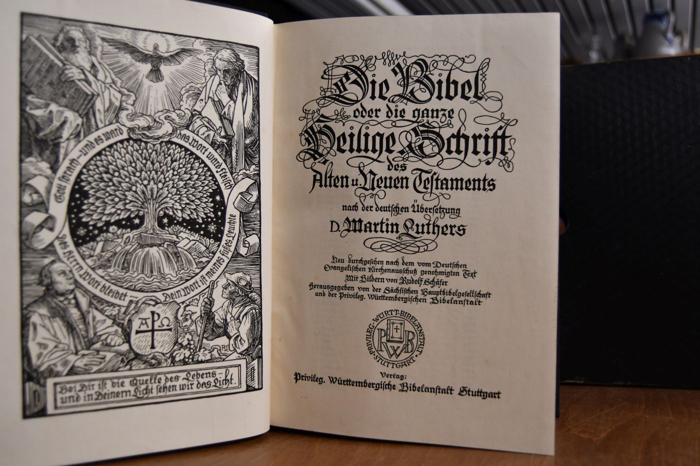 Neu durchgesehen nach dem vom Deutschen Evangelischen Kirchenausschuß genehmigten Text. Mit Bildern von Rudolf Schäfer. Herausgegeben von der Sächsischen Hauptbibelgesellschaft und der Privileg. Württembergischen Bibelanstalt.